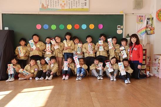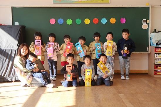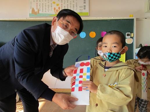 七五三は、子どもたちの健康で健やかな成長を願う行事として行われてきました。本園では、子どもたち一人一人が手作りした千歳飴袋に美味しい千歳飴を入れて、園児たちの健康を願い園長から一人一人に手渡しました。