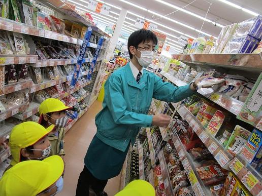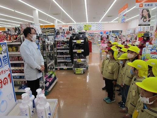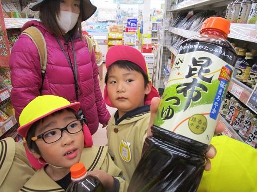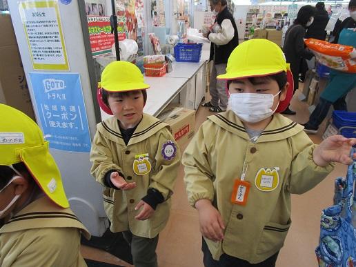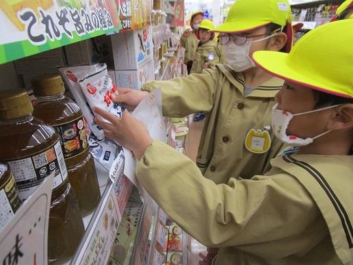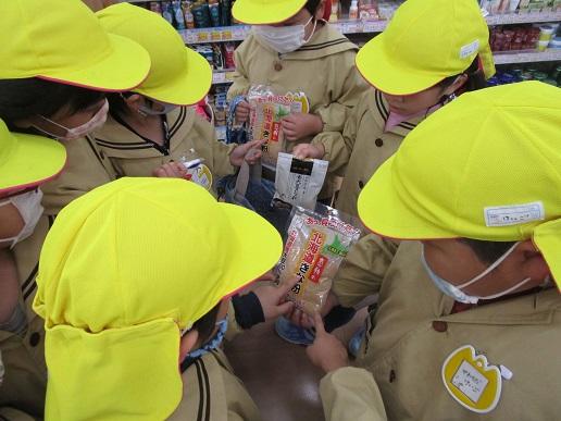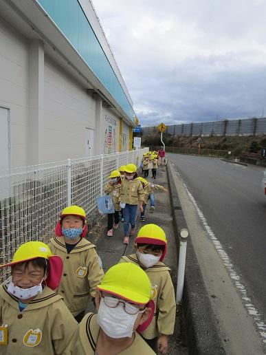 11日26日(木)、年長さんは近くのハシドラッグに、餅つき会の用具を買いに行きました。