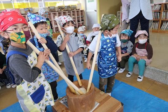 全園児が千本杵で餅つき体験です。餅つきの前に、蒸かしたもち米をちょっとだけ試食しました。思わず子どもたちは「美味しい」と声をあげていました。