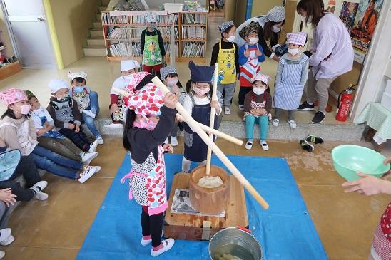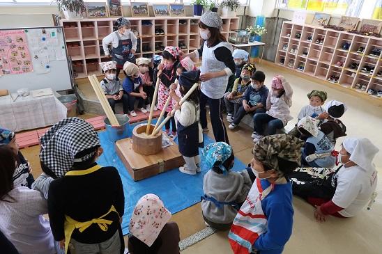 11月30日(月)に、餅つき会を開きました。12月になっての実施を予定していましたが、小学校への引っ越しもあるので、早めの実施となりました。また、感染症拡大防止ため、外部講師は呼ばず、園内だけでの実施としました。