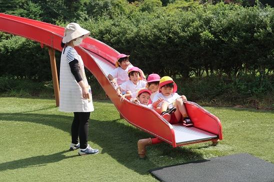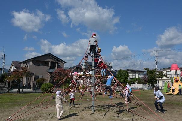 笹谷公園では、一緒に遊具で遊んだり、サッカーをしたり、缶蹴りをしたりしました。最後に4つの幼保混合チームでリレーをしました。