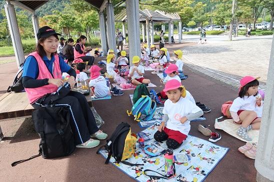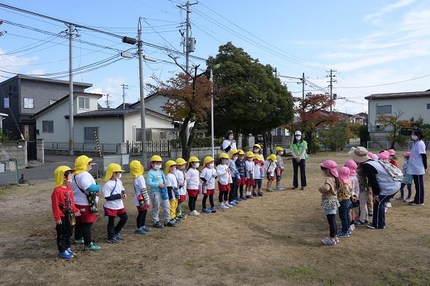 笹谷公園に到着すると笹谷保育園の園児たちも到着していました。最初に顔合わせです。はじめてなので少し緊張していました。