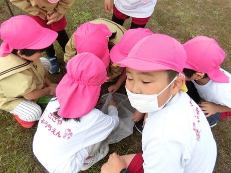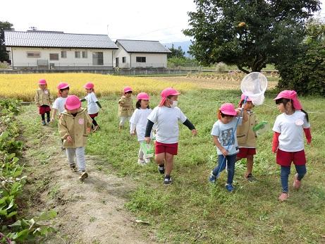 今日は天気がよかったので、年少着く仕組みは、園畑のかがやきファームに虫取りにいきました。