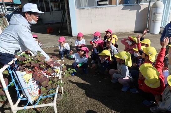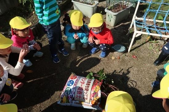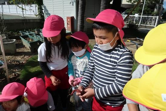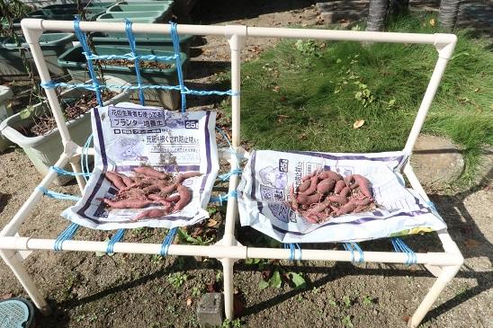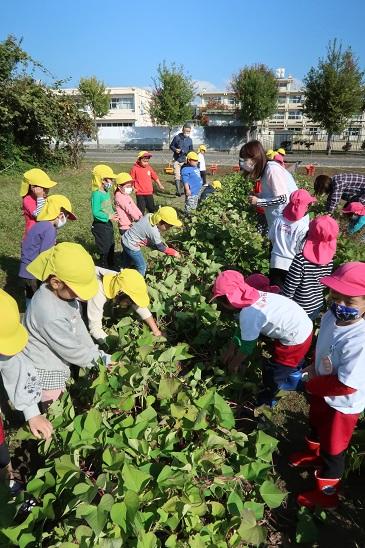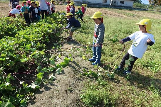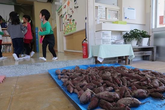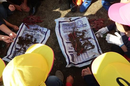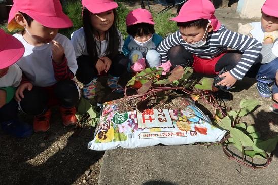 その日の降園のとき、園児を迎えに来た保護者の方にも同じように「空中栽培のサツマイモ、縦と横どちらがたくさんできたかな」と聞いてみたところ、以外や以外「こっち方が、色艶かいいから、こっちかな」と量より質に感心があるようです。