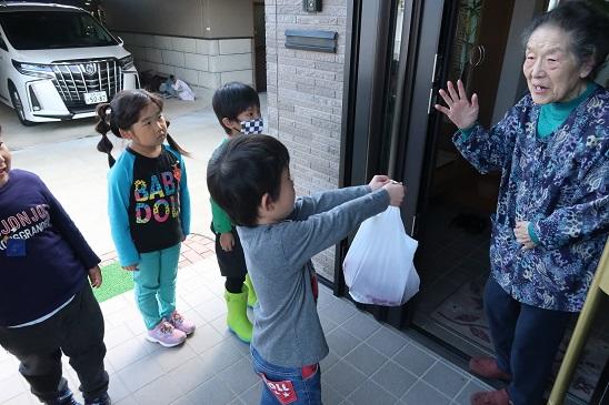 大きな声でださないでね。感染症対策をしてのおやつです。