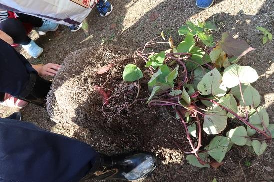 ほら、つるの根元にさつま芋があるよ。ここ掘ればいいんじゃない。