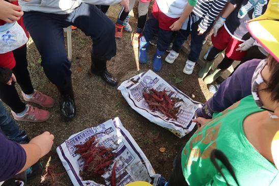 縦の肥料袋と、横の肥料袋のサツマイモ、さあどちらがたくさんできているでしょうか。子どもたちの予想は半々に分かれました。