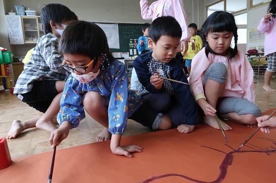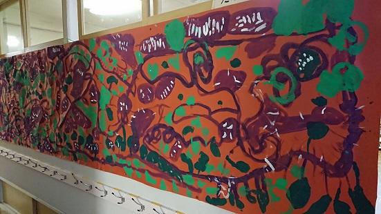 20名の画家の誕生です。真剣にサツマイモ収穫の感動を描いています。その巨大壁画が出来上がっていく様子です。