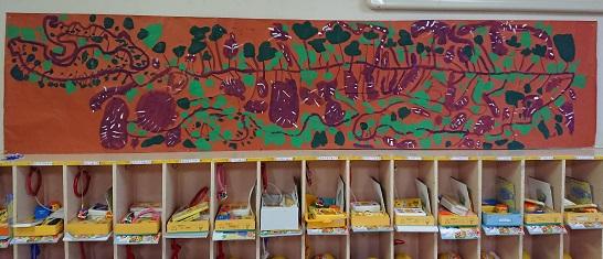 2020年10月23日 16時55分年長たけのこ組の教室背面と廊下壁面に、巨大壁画が出現。