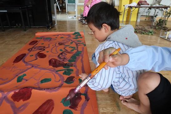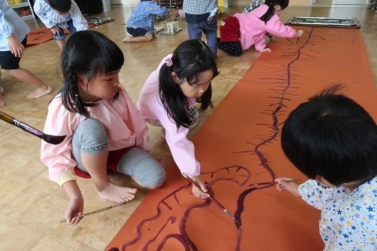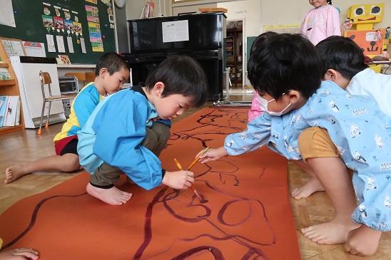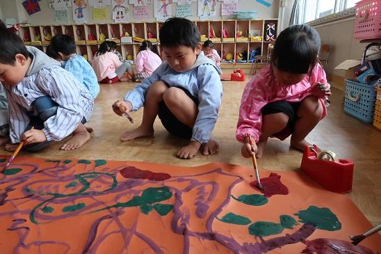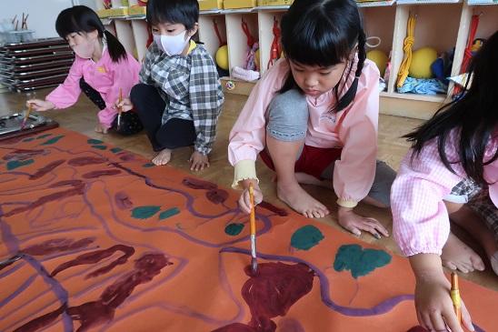 21日(水)のサツマイモ堀りをした体験の感動を、年長たけのこ組の20名の園児が共同絵として製作しました。