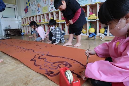 年長たけのこ組の教室背面と廊下壁面に、巨大壁画が出現。