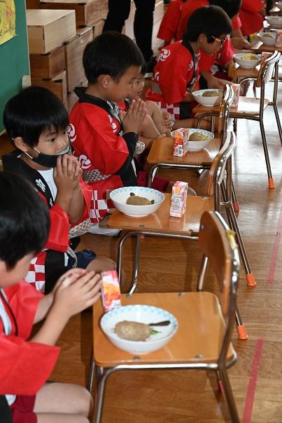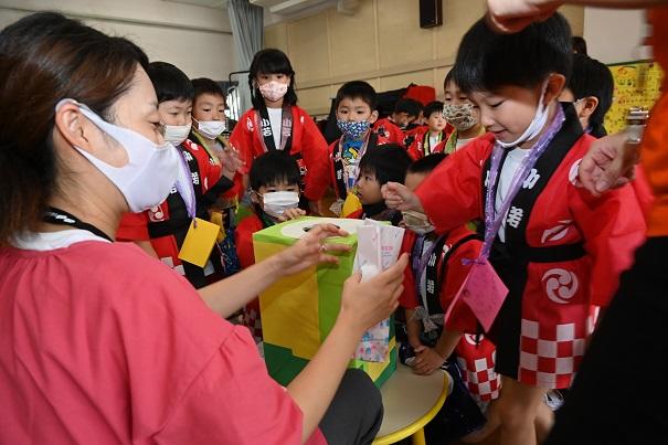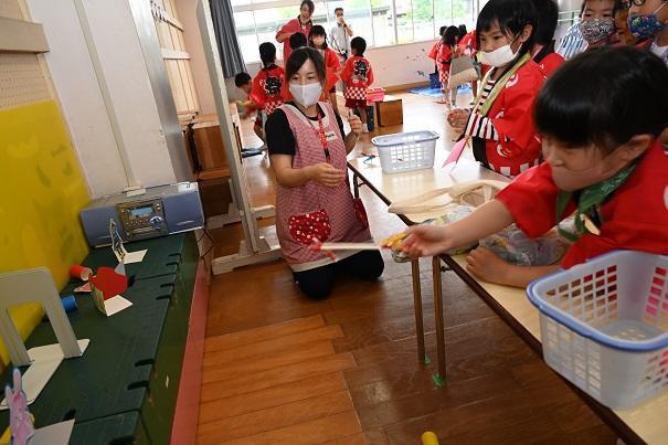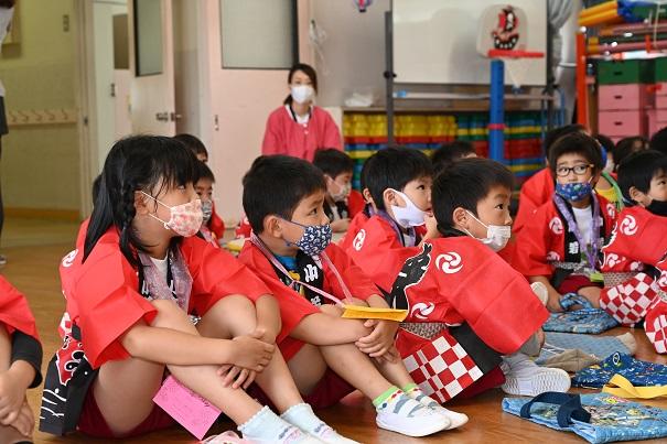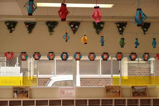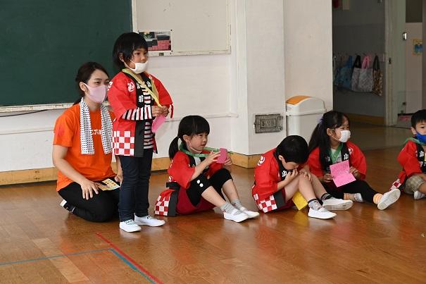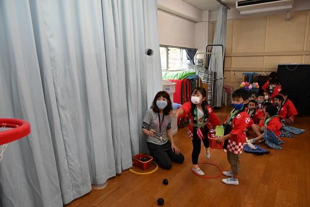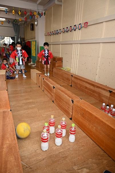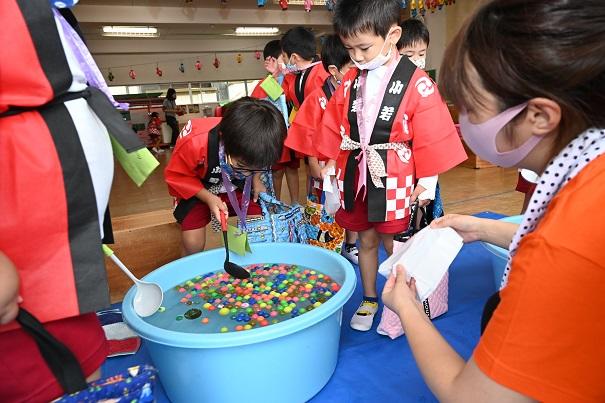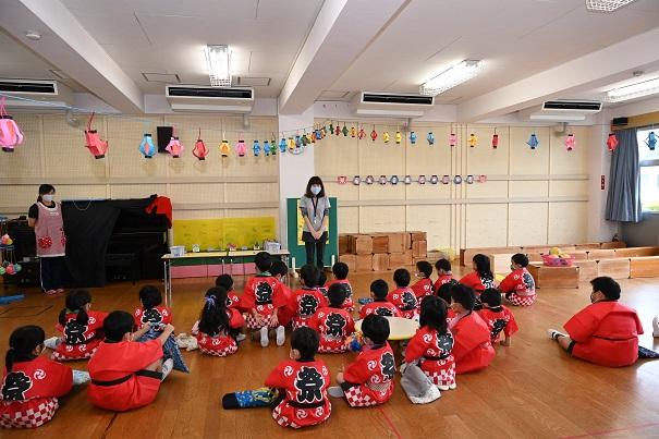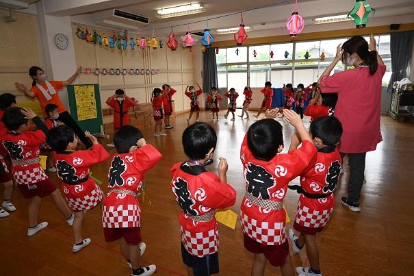 感染拡大防止から、園児だけでの開催です。園児たちの手作りちょうちんが夏祭りを盛り上げています。