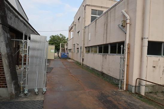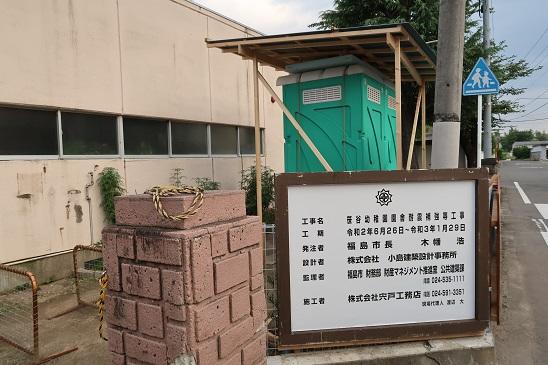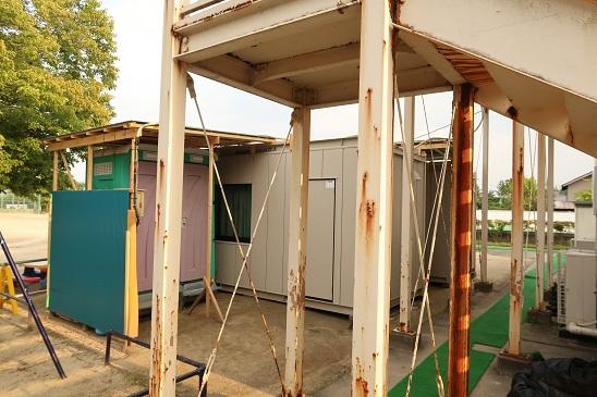①工事表示板と、その後ろにあるのが先生用の仮設トイレです。