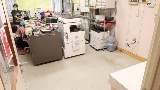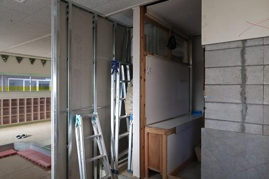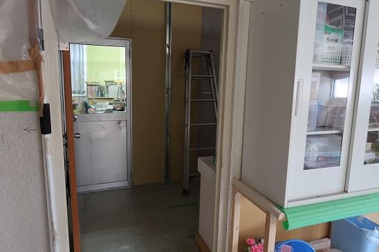 ②職員室は、スペースを空けた出入り口付近が工事となります。