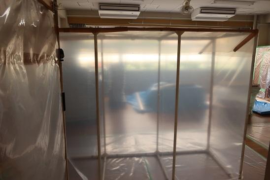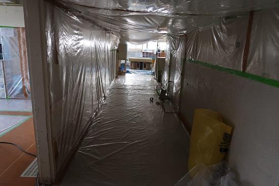 1階部分の耐震工事箇所の仮囲い進行中です。
