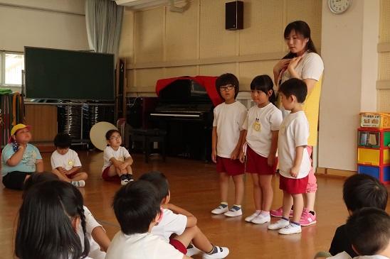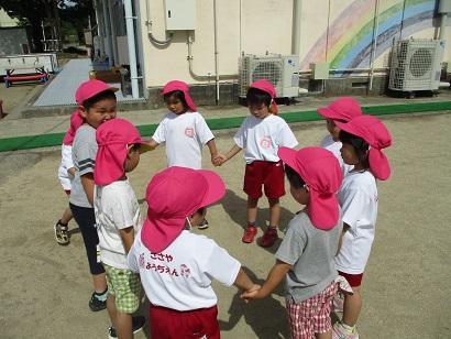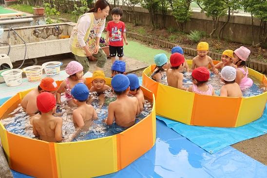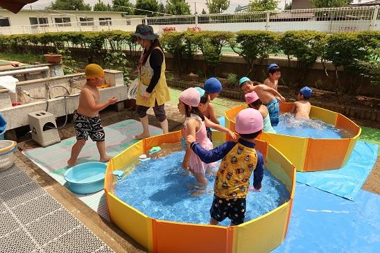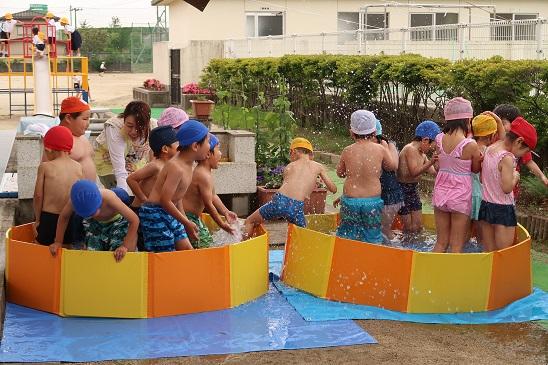 水を怖がる子どもはいません。水をかけあったり、もぐったり、楽しい歓声が園庭にひびきました。
