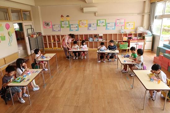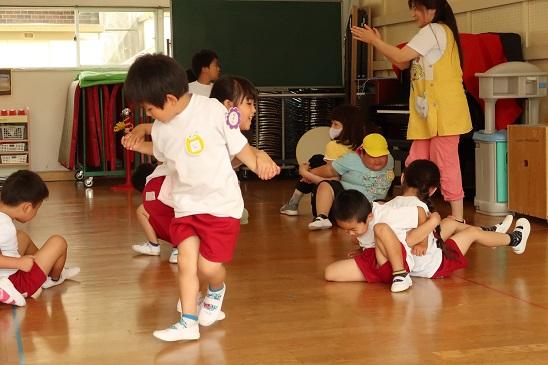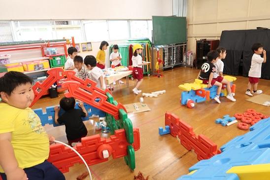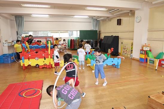 年長は遊戯室で、年少は保育室で、自由遊びを楽しんでいます。