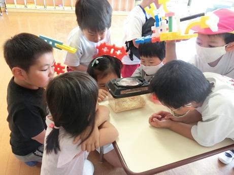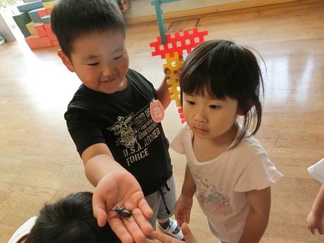 お友達がクワガタを見せるためにもってきてくれました。つくし組の子どもたちは、食い入るように見ていました。