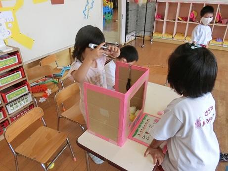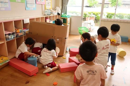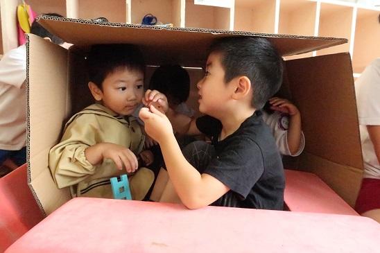 年少は、テントに見立てた段ボールや、バーベキューで、室内キャンプをしたりしています。