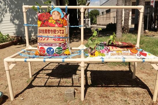 今回は、肥料袋に植えて特製椅子の上に置くことにしました。縦にした肥料袋と横にした肥料袋で育ち方を比べることにしました。子どもたちに、どちらがよく育つか聞くと、意見は半々でした。水やりをしながら、どんな風に育つか子どもたちは今から楽しみにしています。