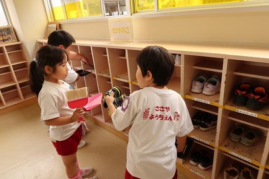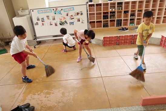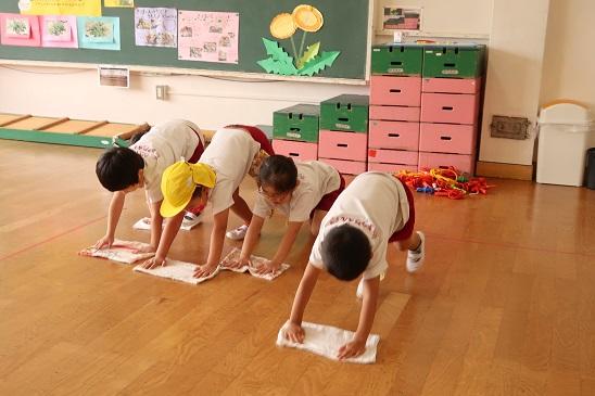 清掃の仕方を話し合ったり、相談して分担したり、初めと終わりの挨拶をしたり、自分たちの園舎が喜ぶように工夫して楽しく活動しています。