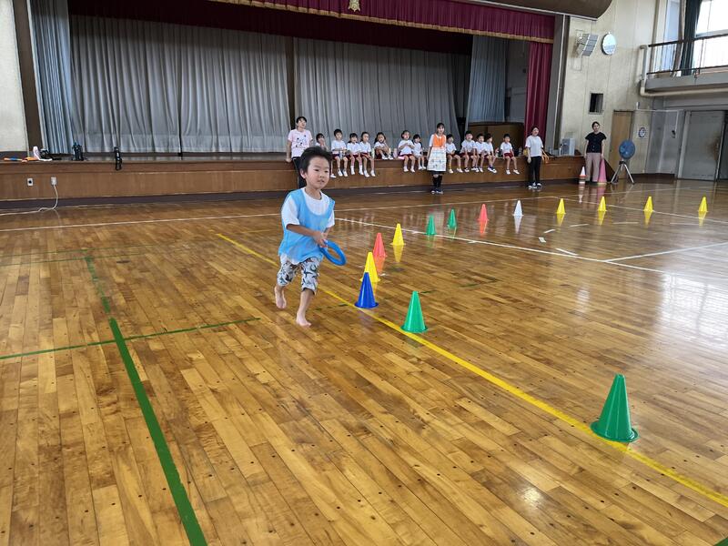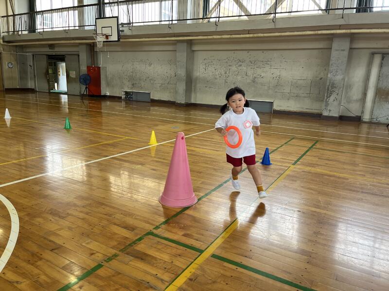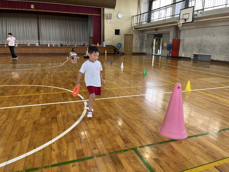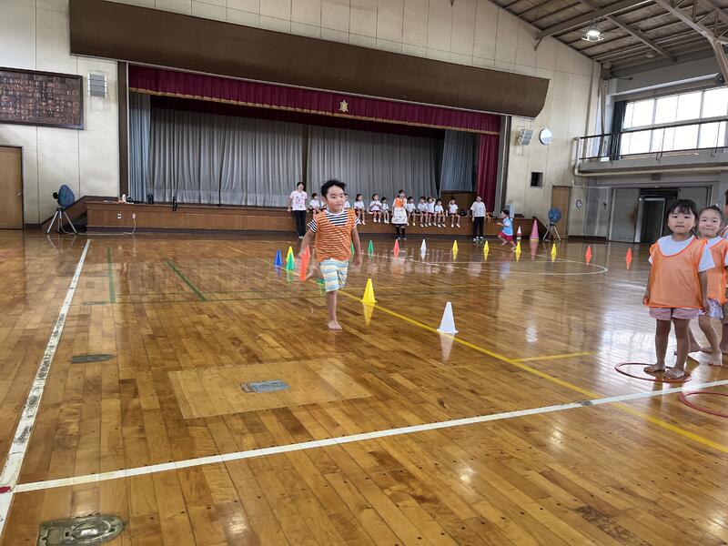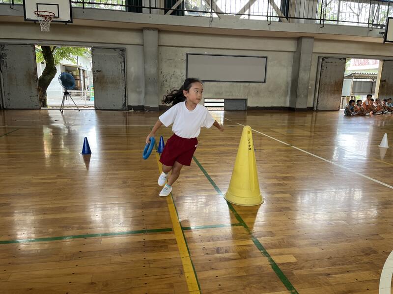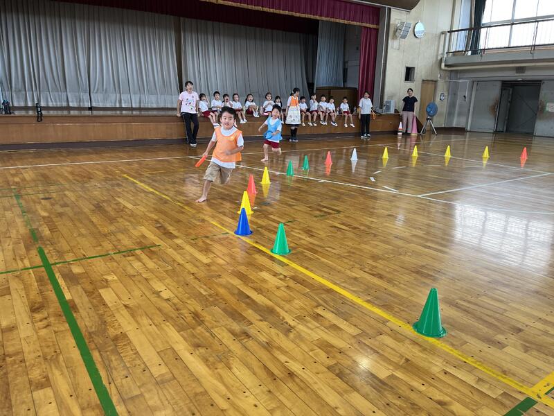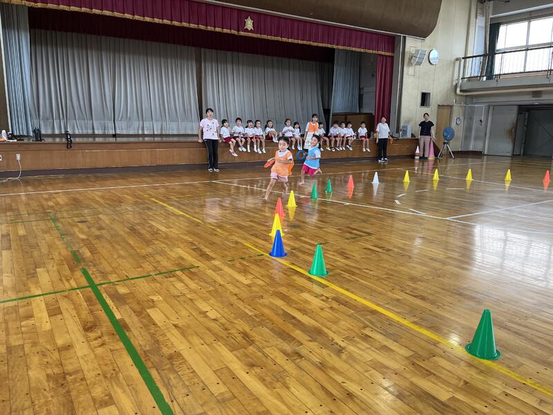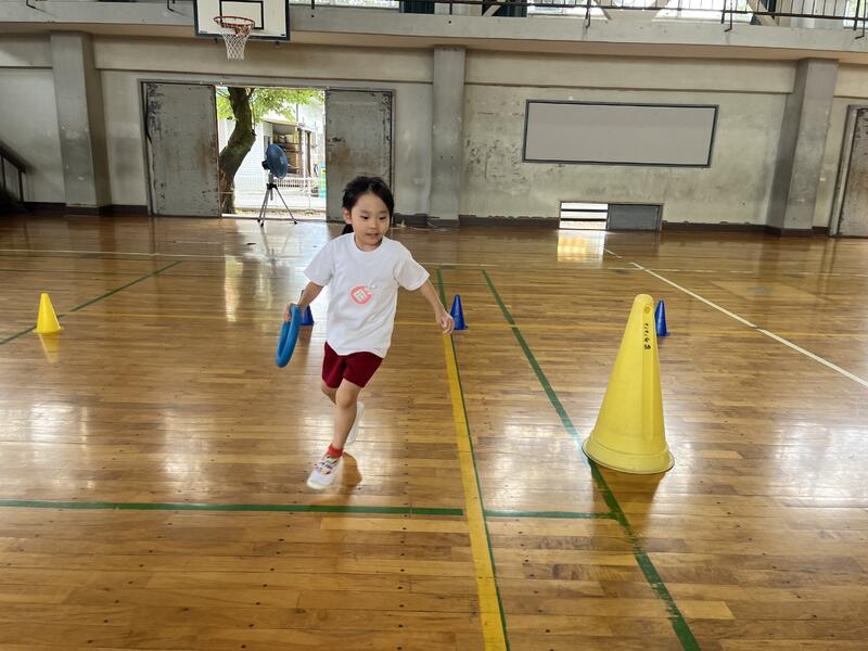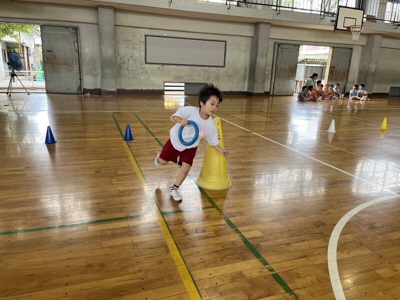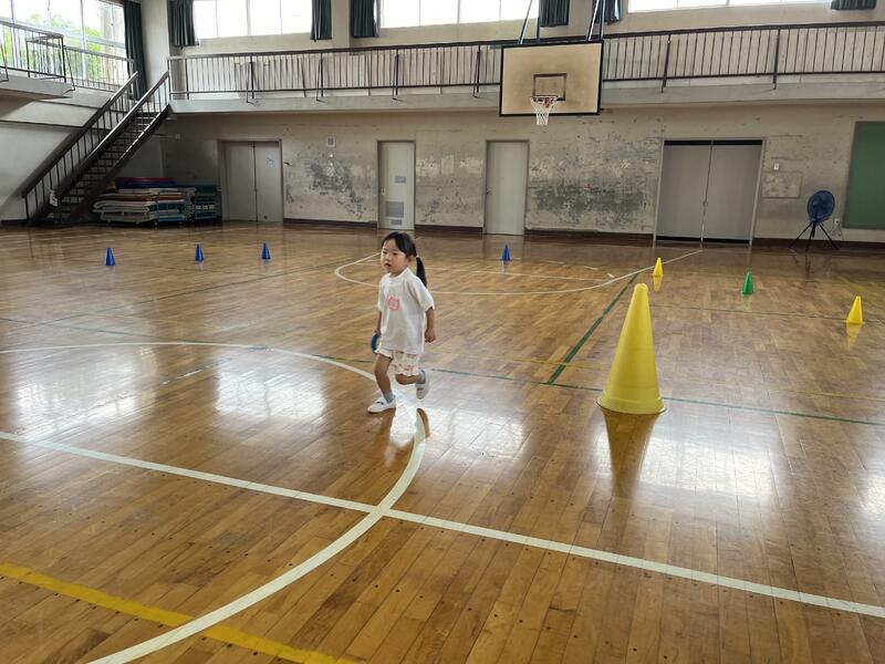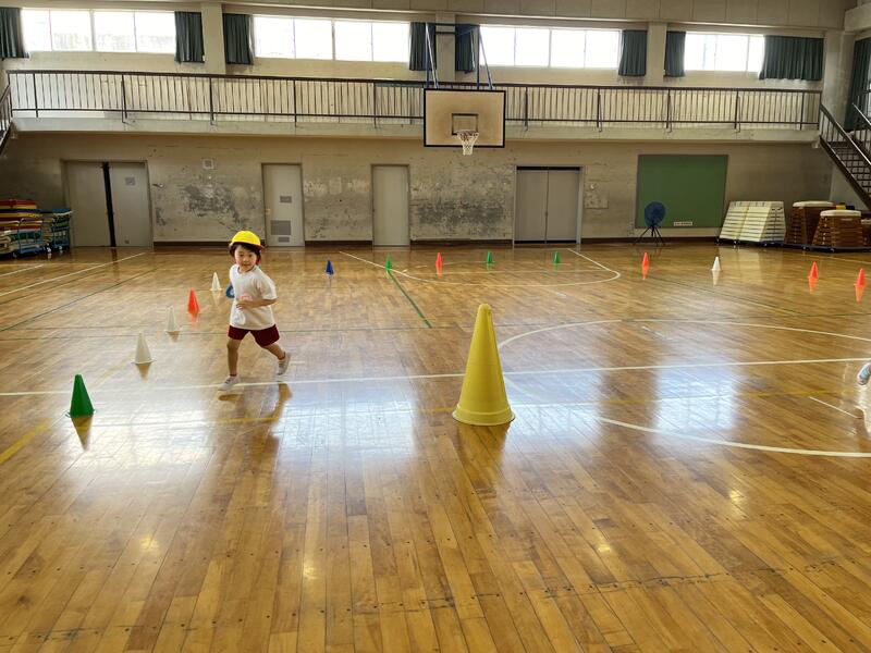 たけのこ組の1回目です。走路のモップがけをし、危険物を除去した上で、裸足で走りました。