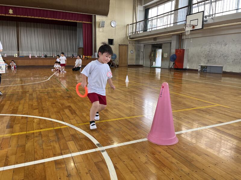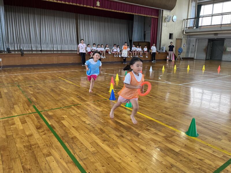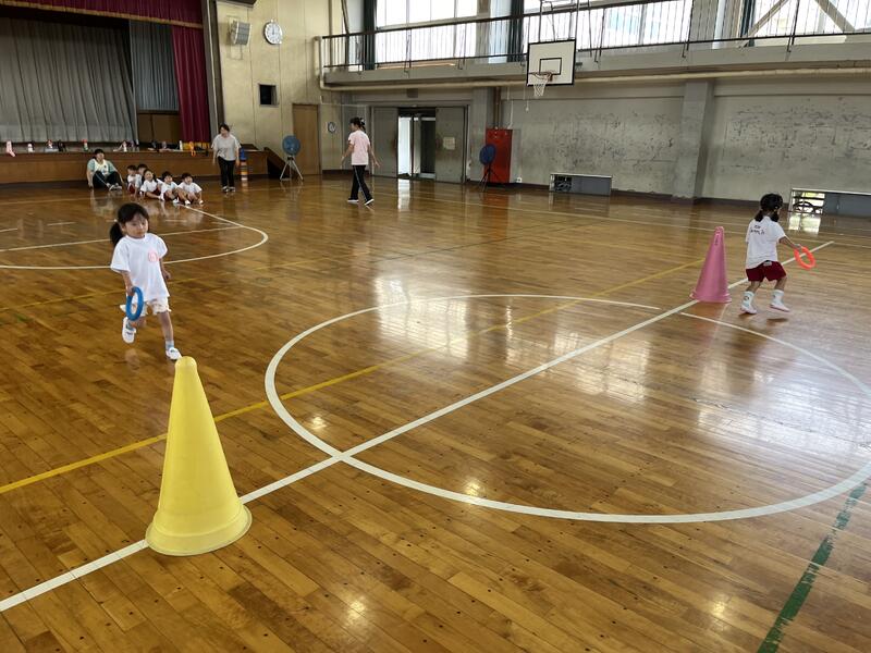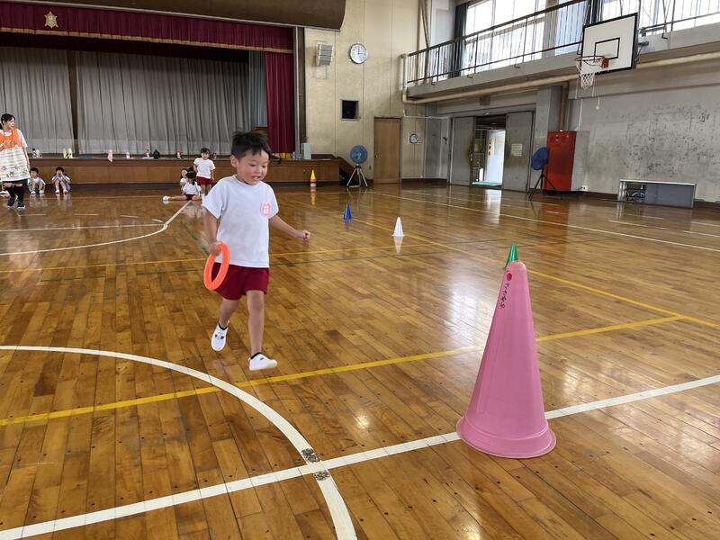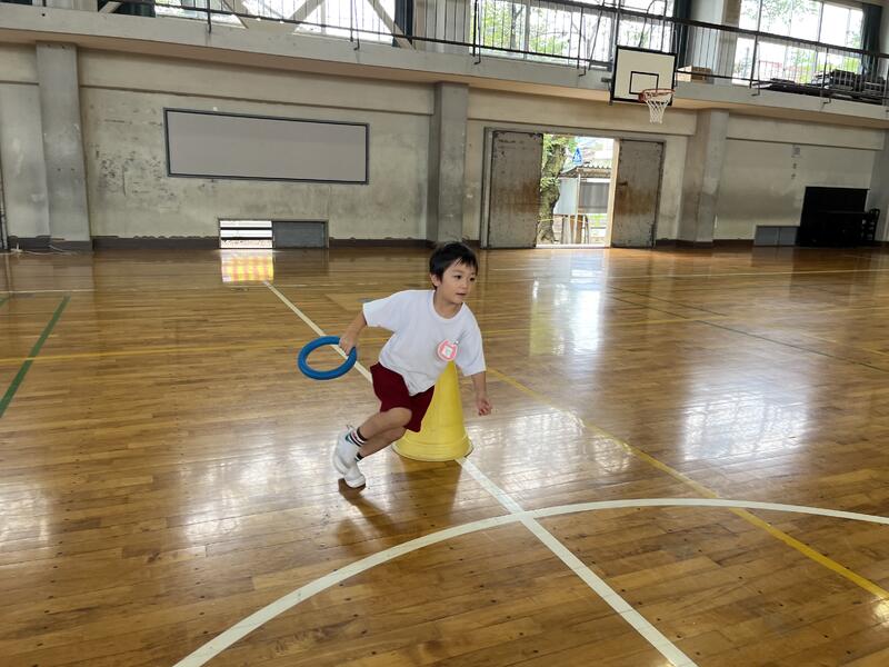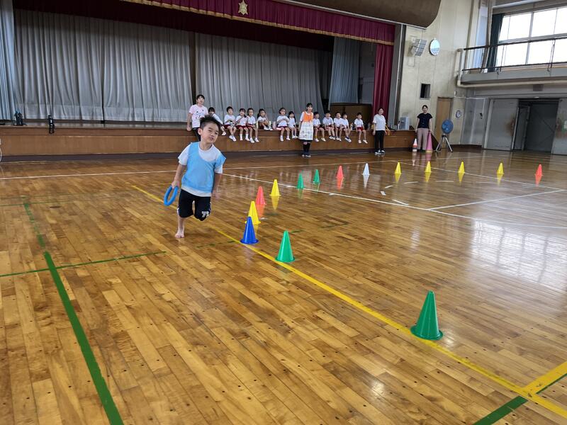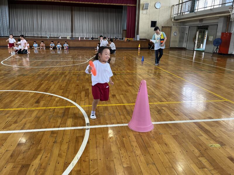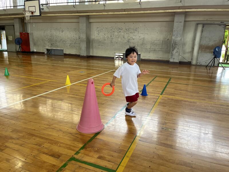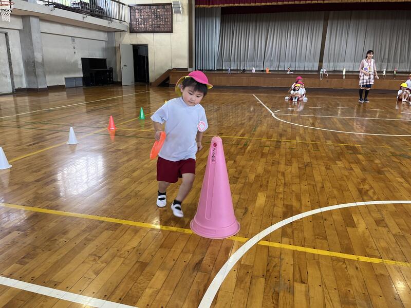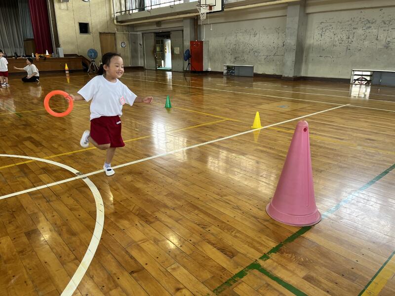 たけのこ組の1回目です。走路のモップがけをし、危険物を除去した上で、裸足で走りました。
