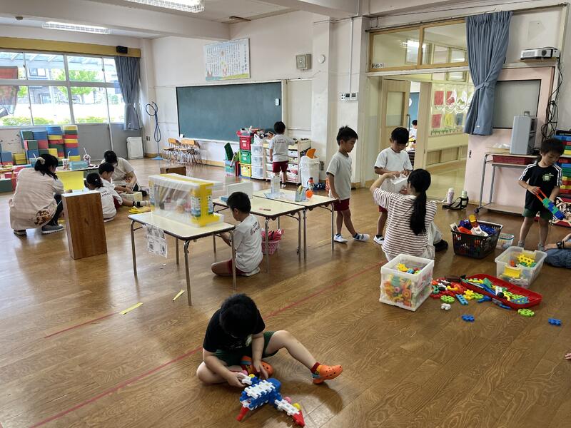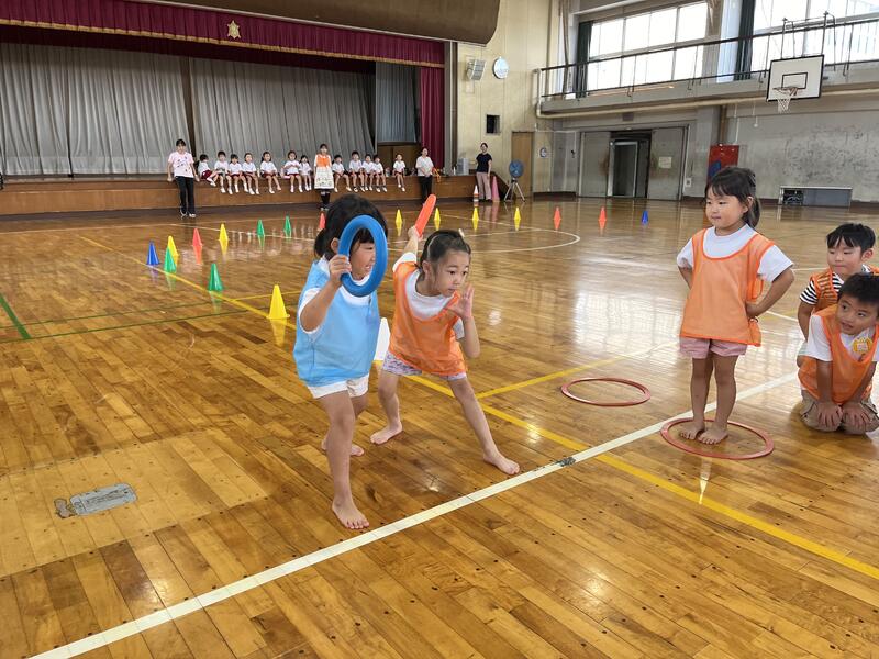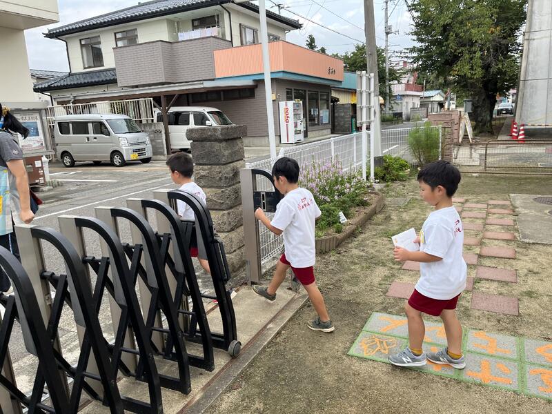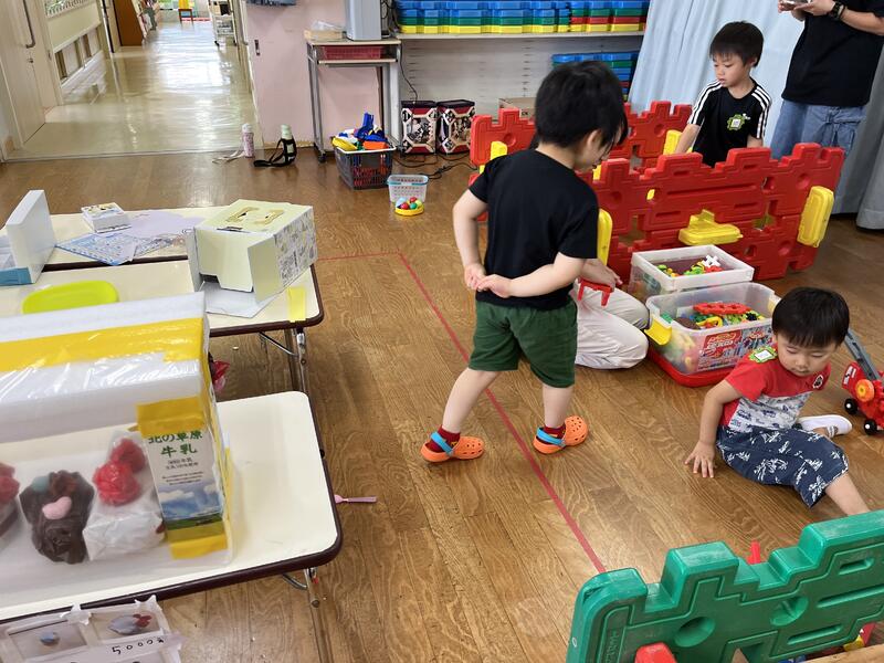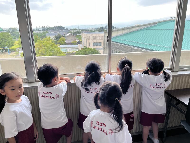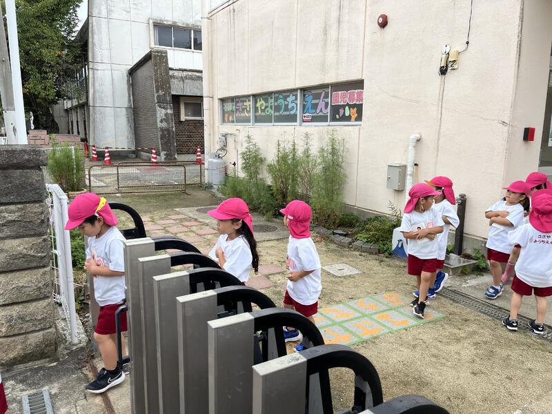 近くの川が氾濫しました。洪水です。1階で活動していた園児たちが、先生方の指示のもと、2階に避難しました。訓練とはいえ、みんなよくできました。
