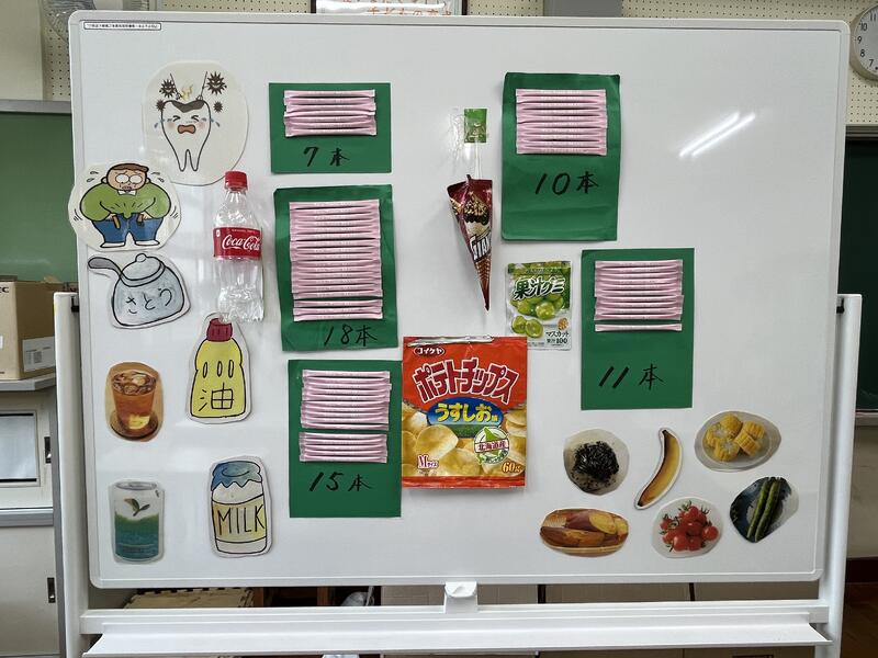 北部給食センターの本田先生から、お菓子やジュースには、どのくらいのお砂糖や油が入っているかなどについて教えていただきました。お菓子を食べたり、ジュースを飲んだりするときの量が大切であることを学びました。