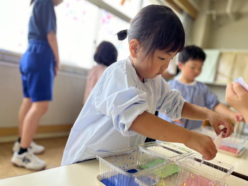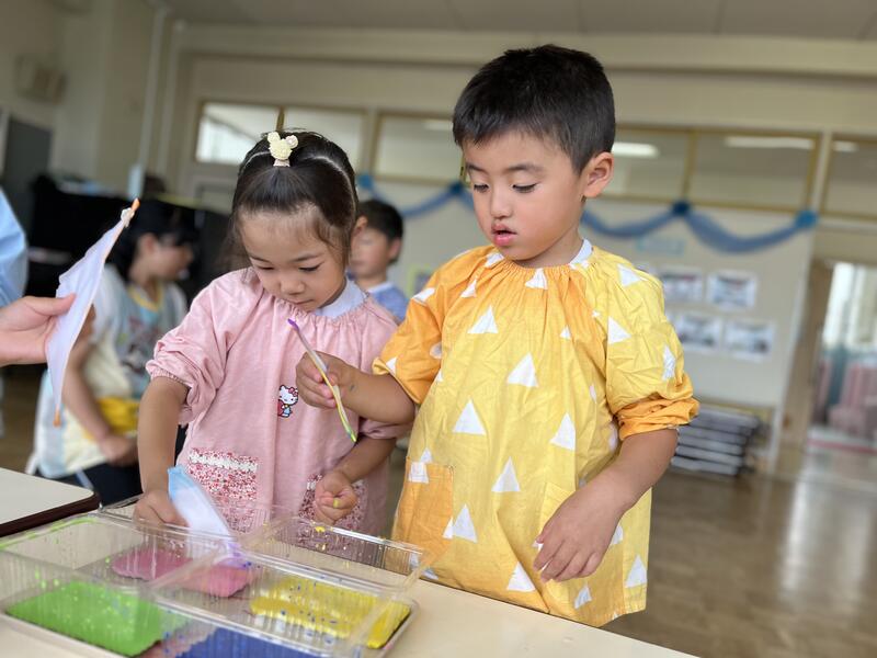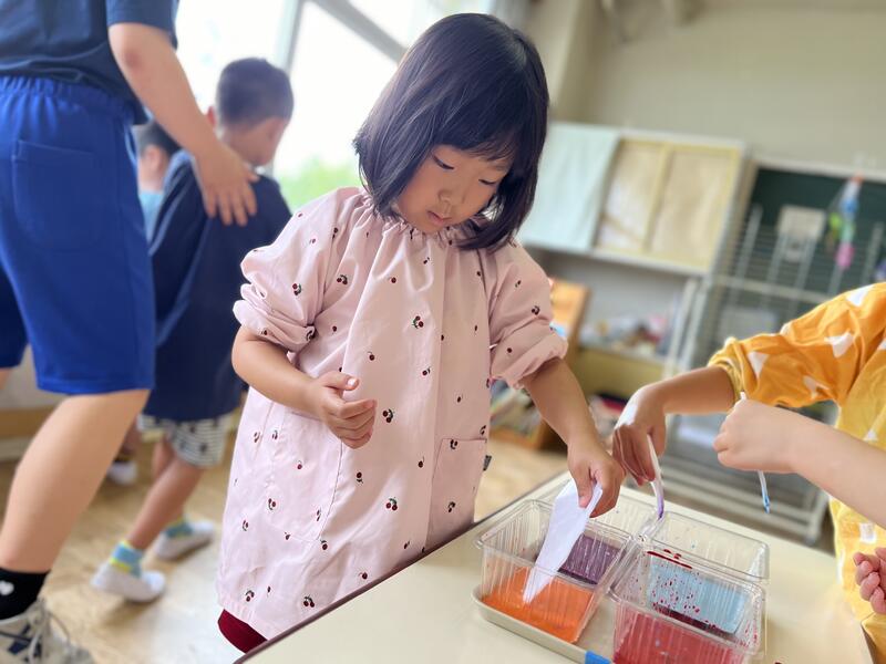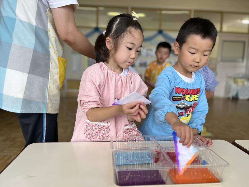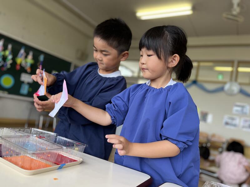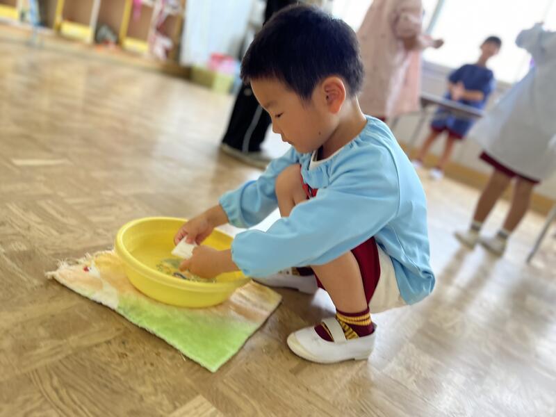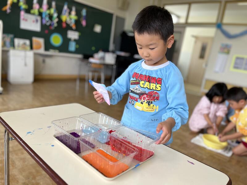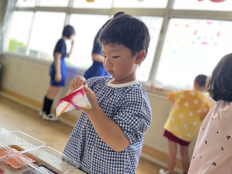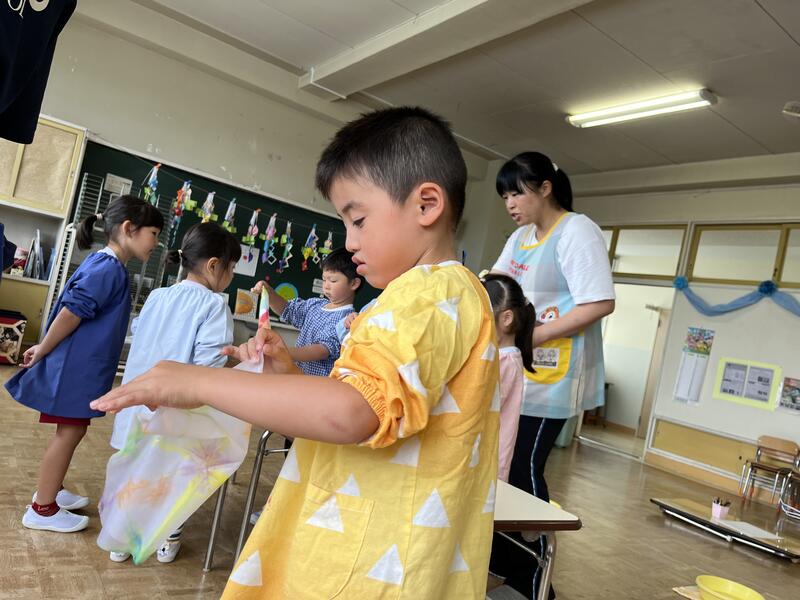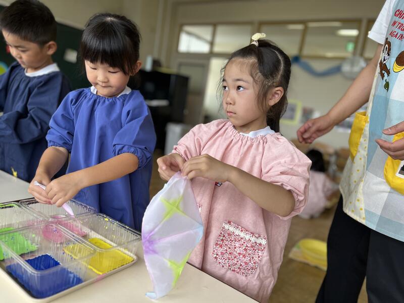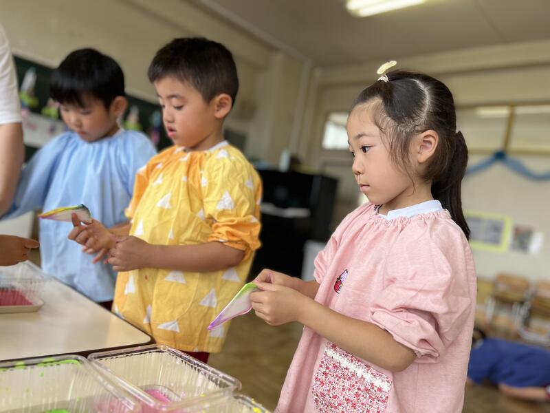 たけのこ組が、浸し染めをしました。