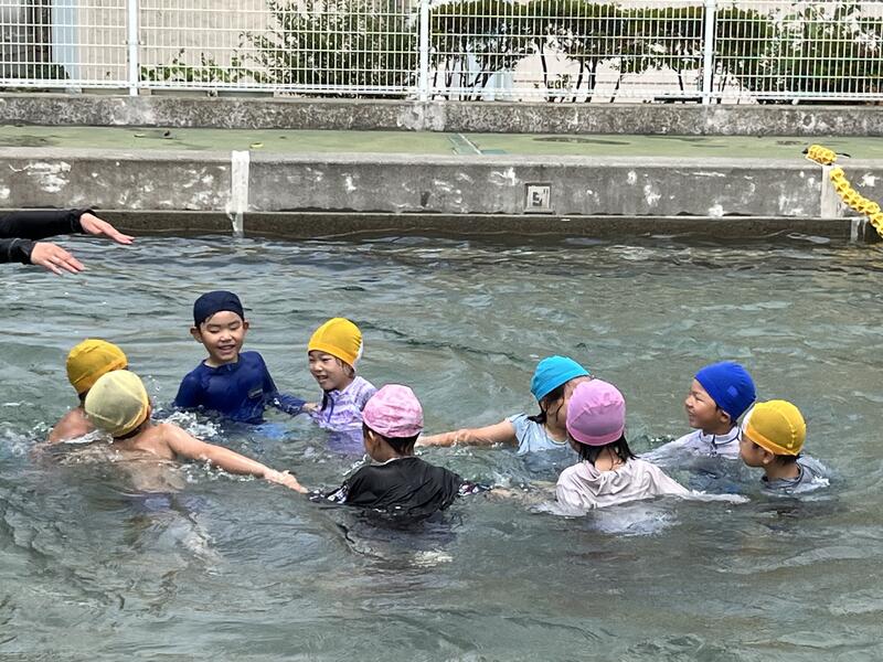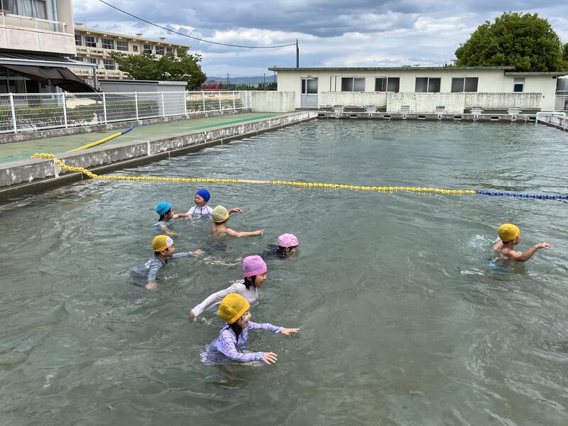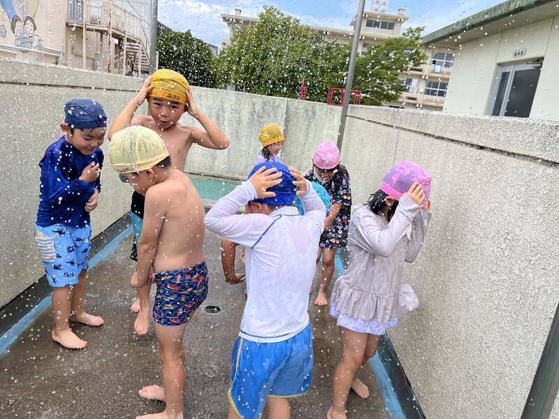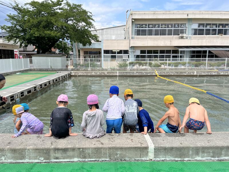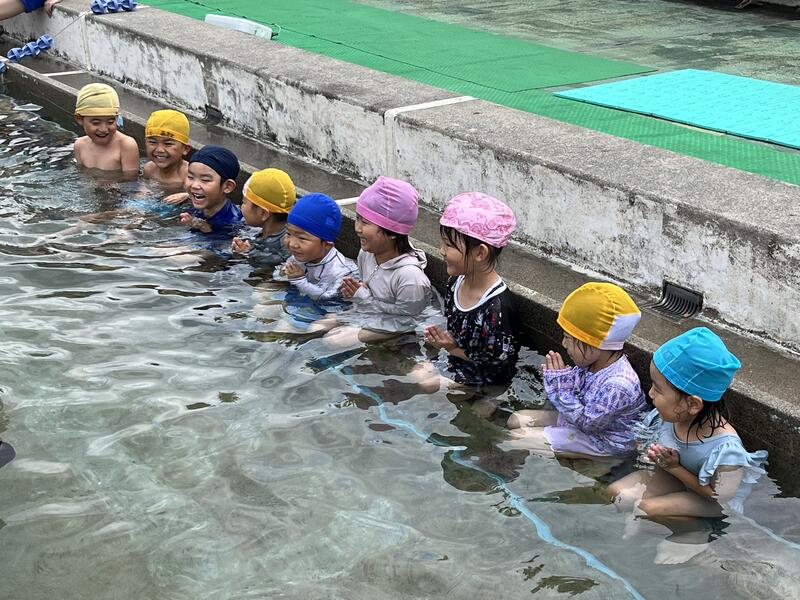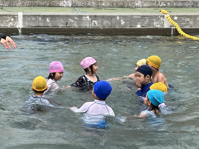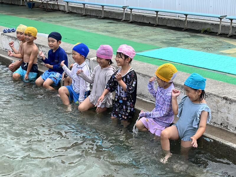 たけのこ組が、小学校のプールに入りました。