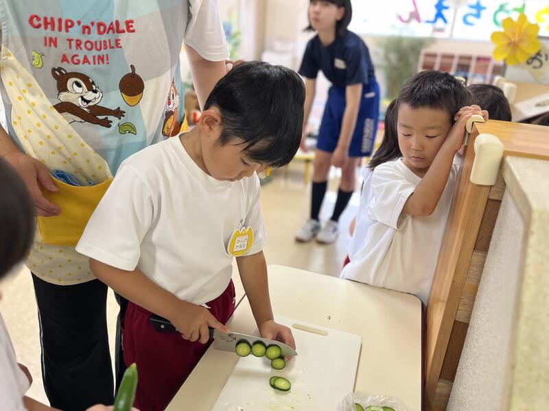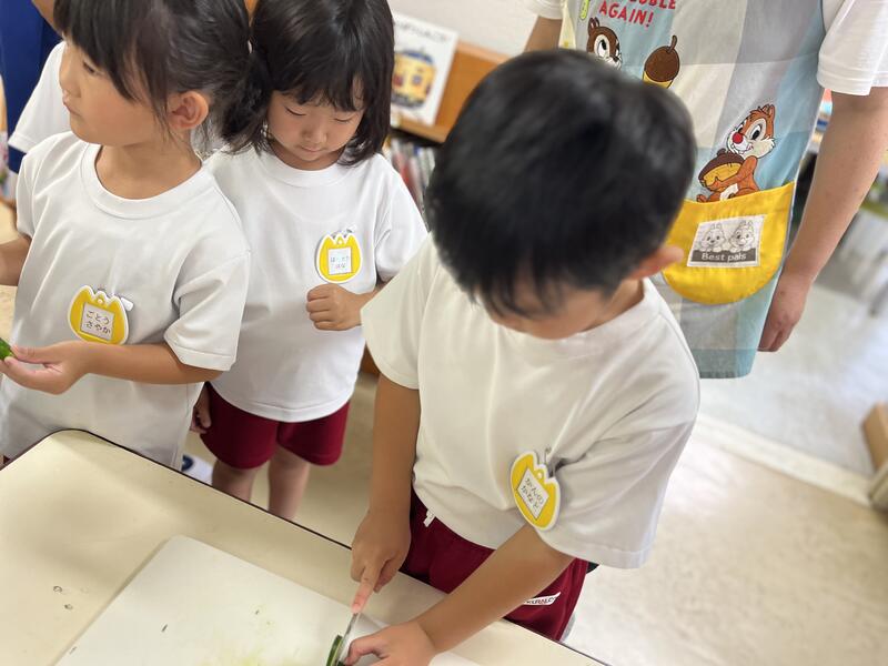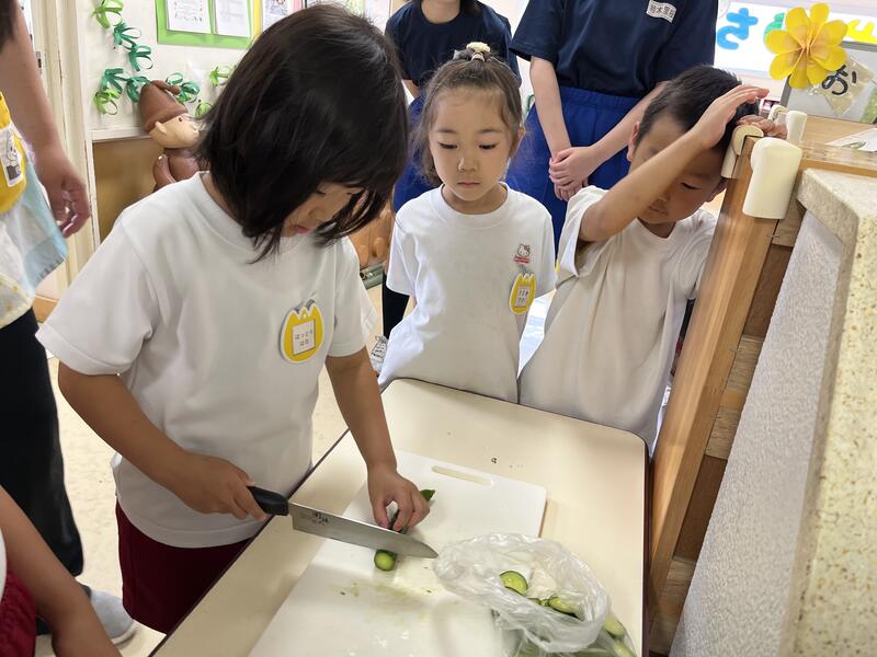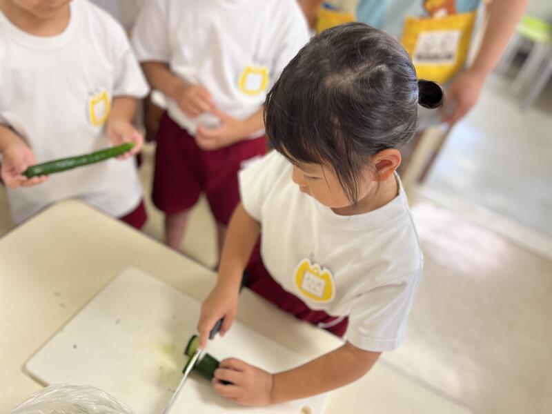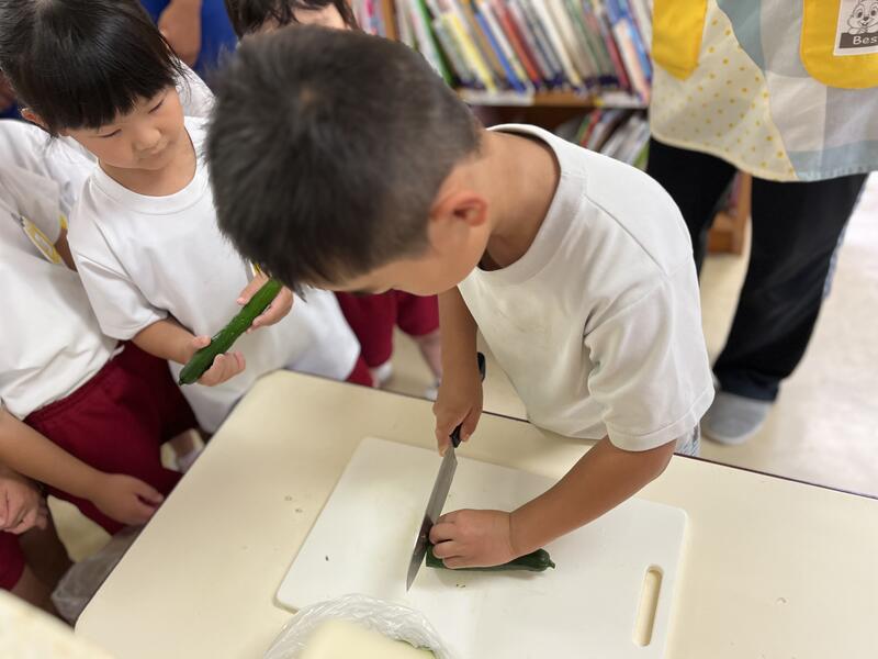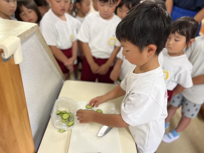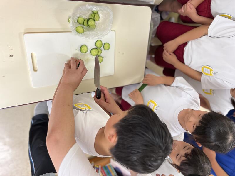 みんなでキュウリを切って、塩もみにしました。