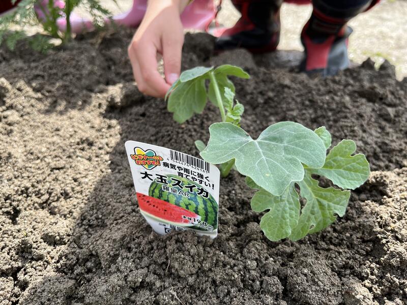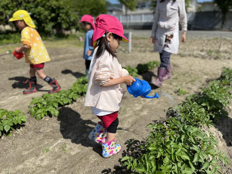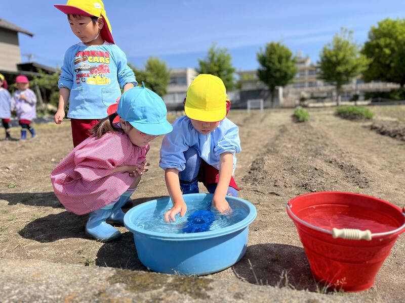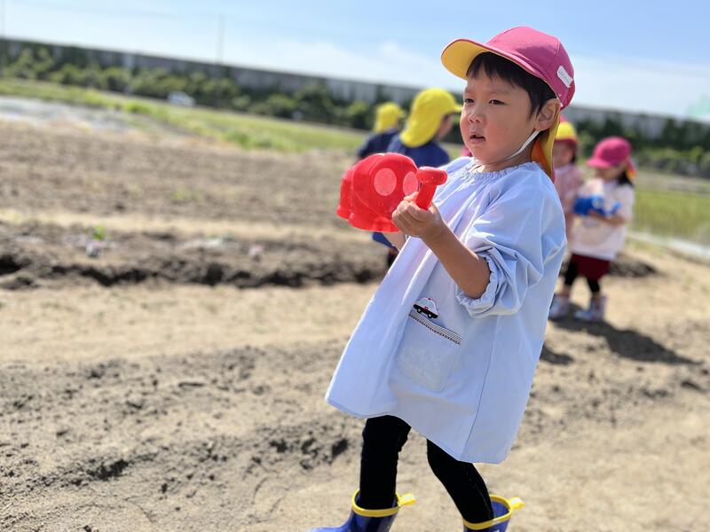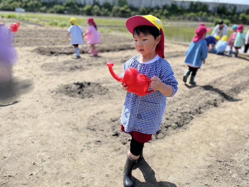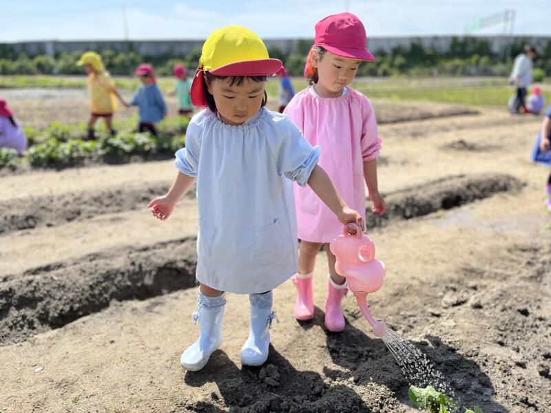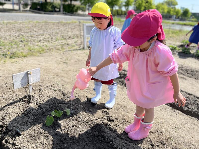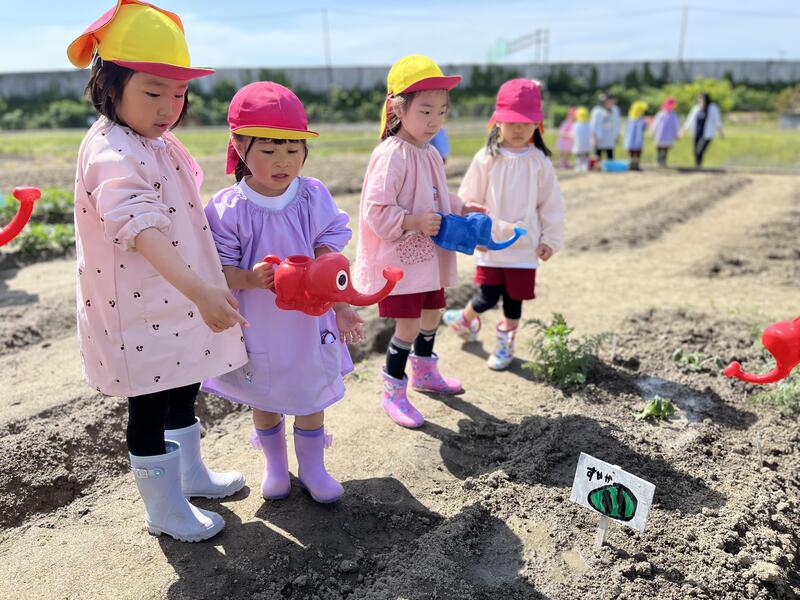 畑に行って、昨日植えた苗にみんなで水をあげました。