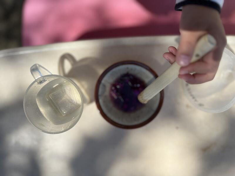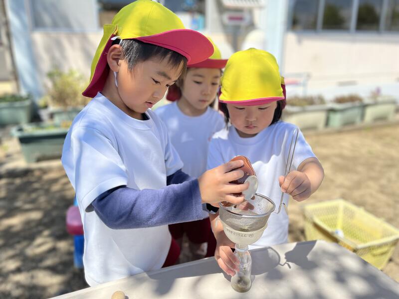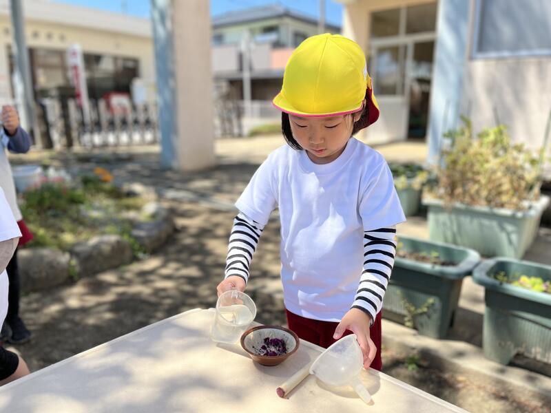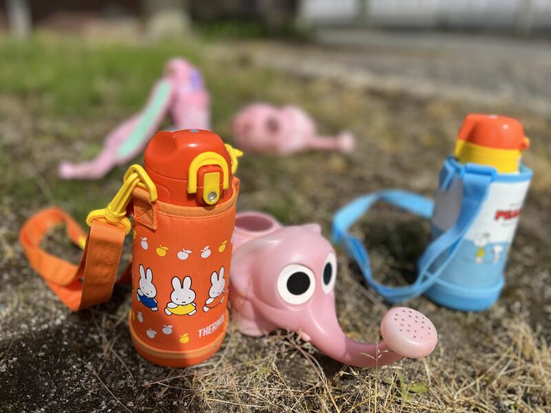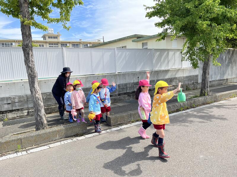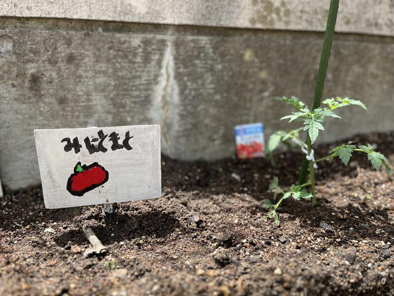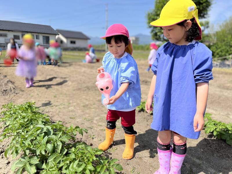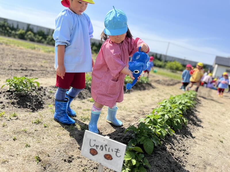 畑に行って、昨日植えた苗にみんなで水をあげました。