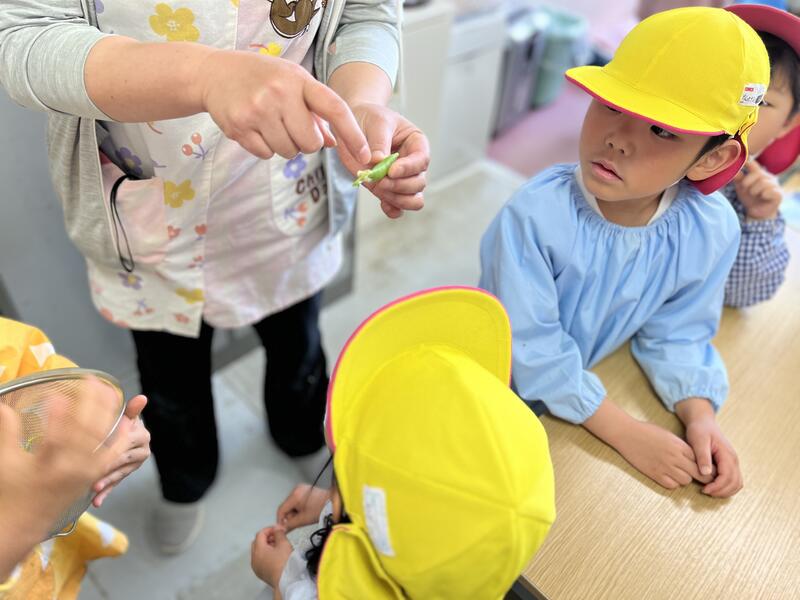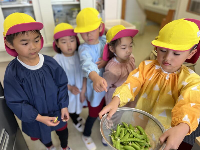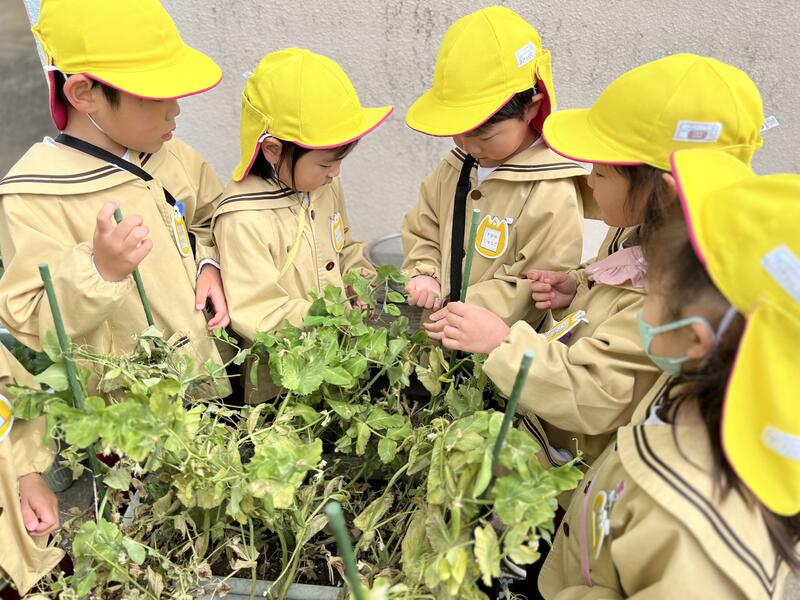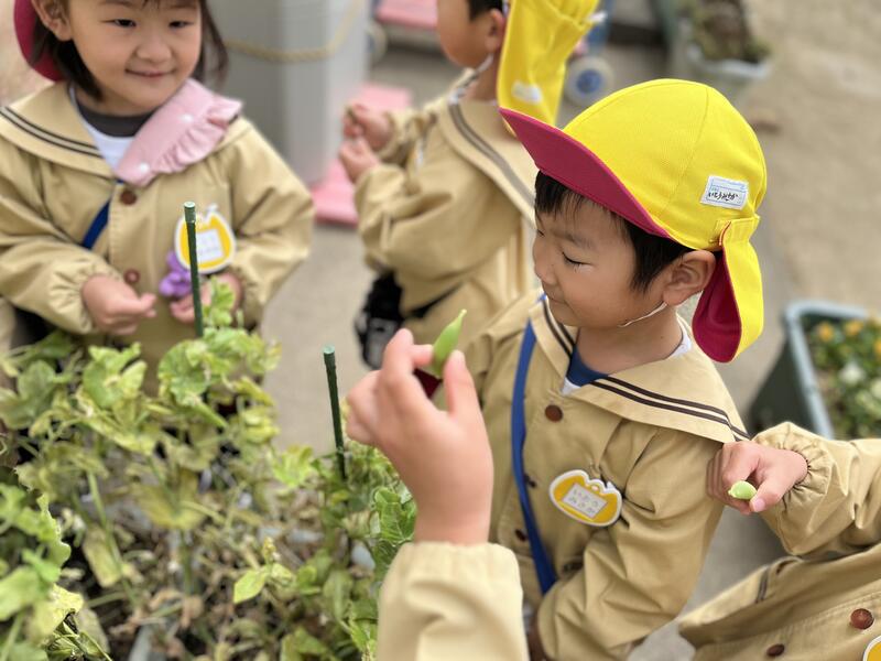 たけのこ組(5歳児)が、みんなでスナップエンドウを収穫しました。