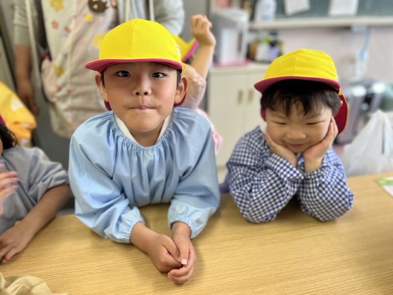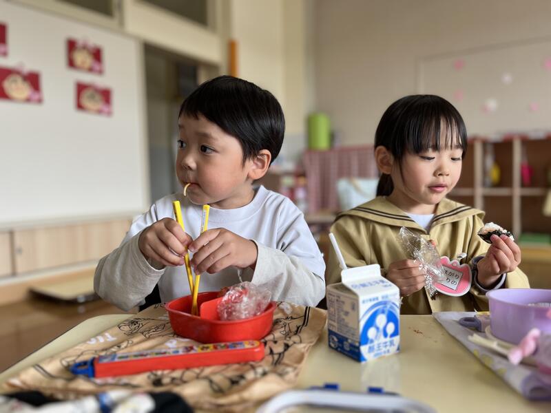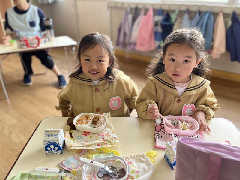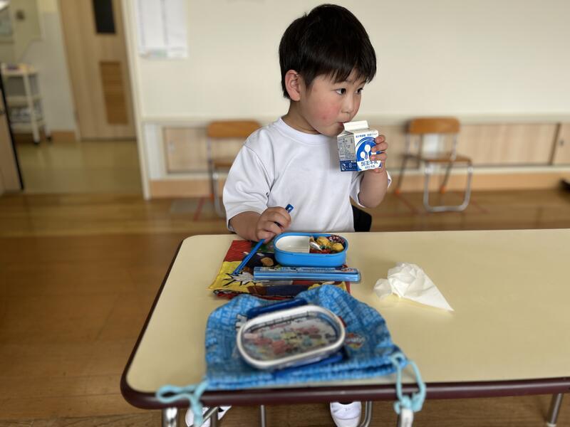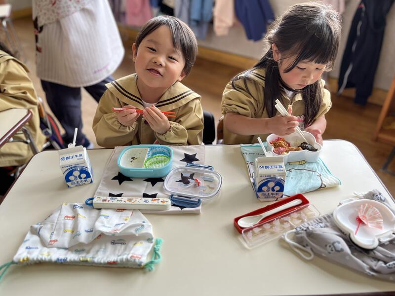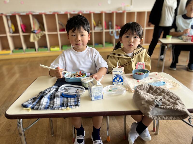 今日は、年少組(4歳児)にとって、初めてのお弁当の日です。みんなおいしそうに食べています。