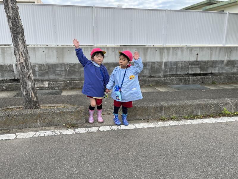 二人で手をつないで、手を上げて渡ります。