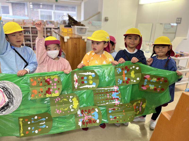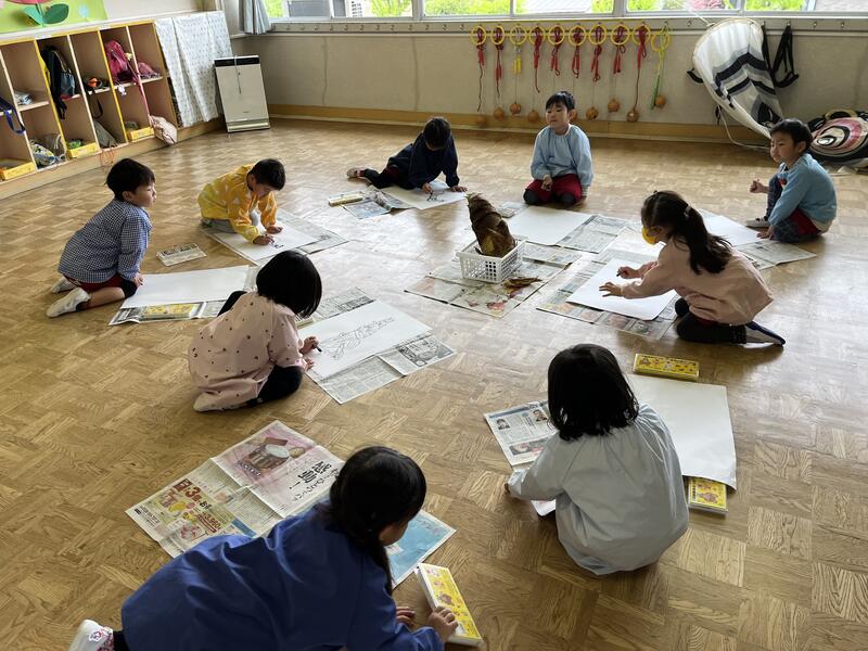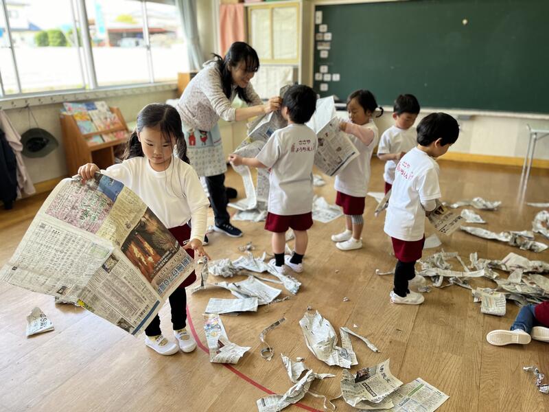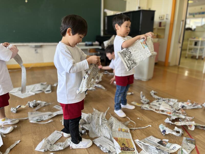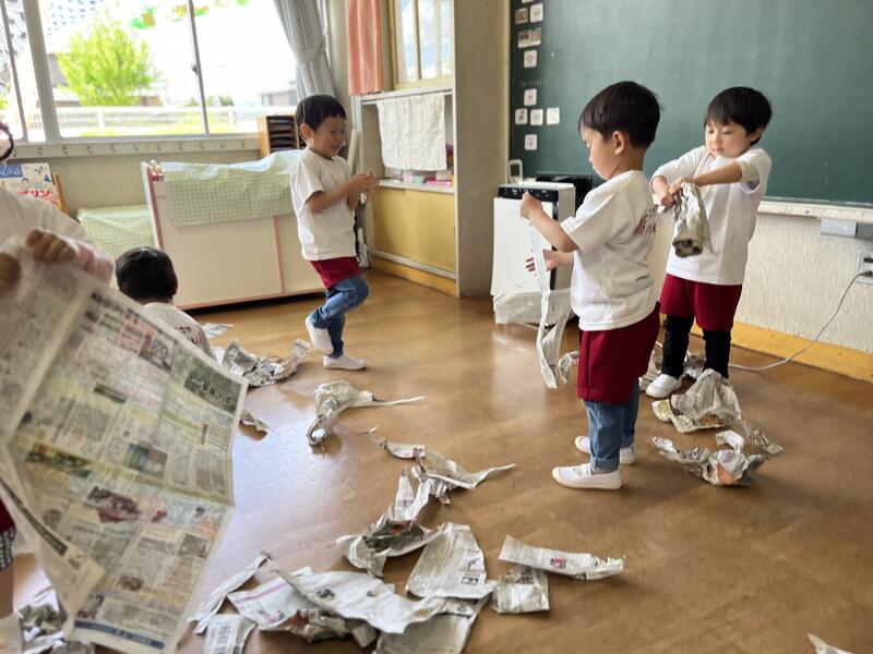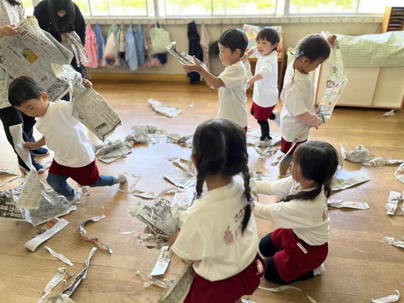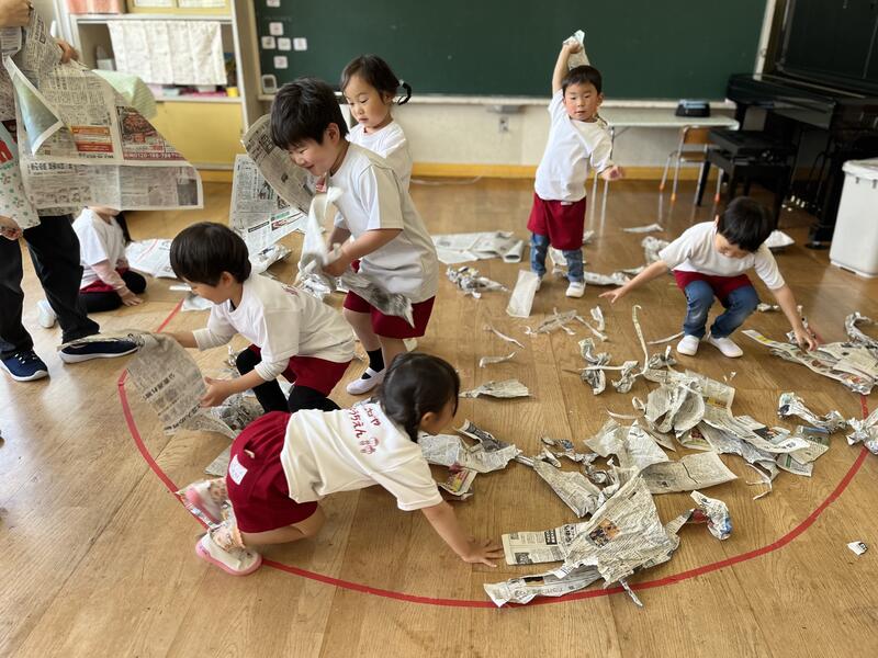 つくし組(4歳児)が、みんなで新聞紙を自由にちぎって、楽しく活動しました。