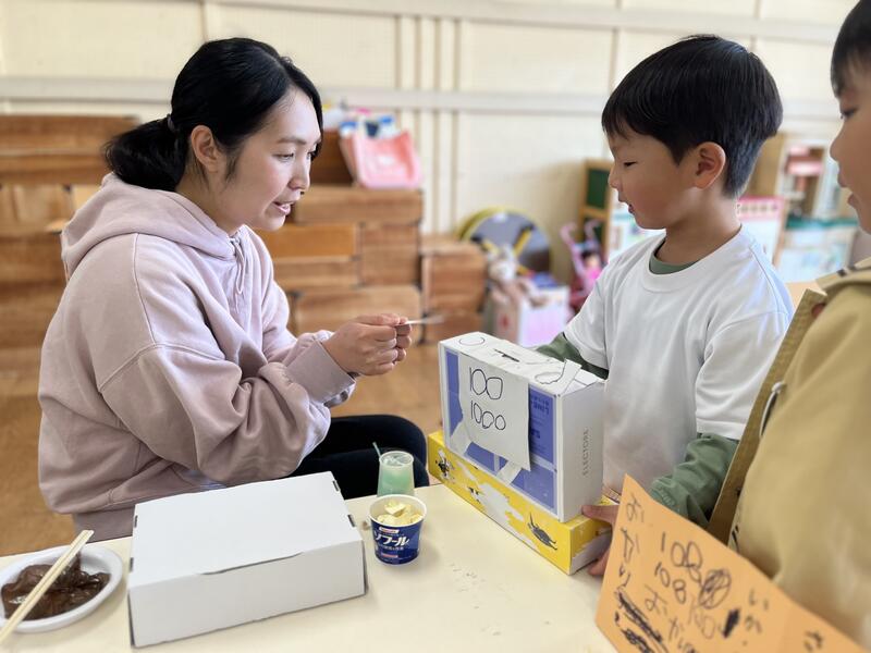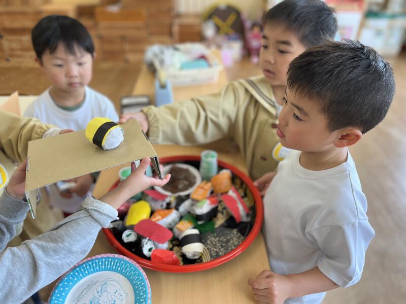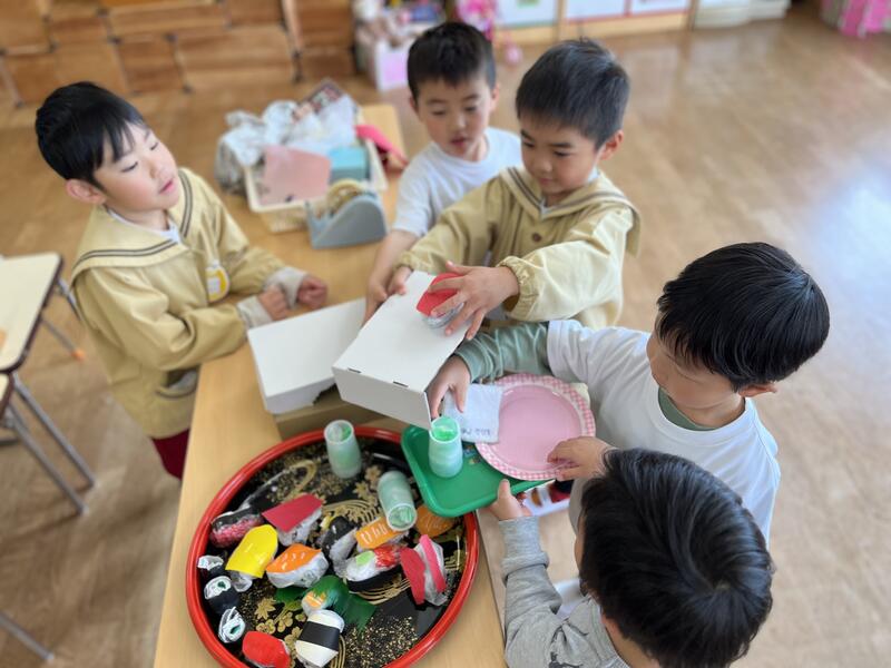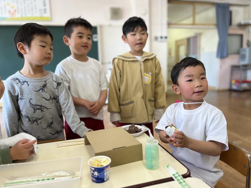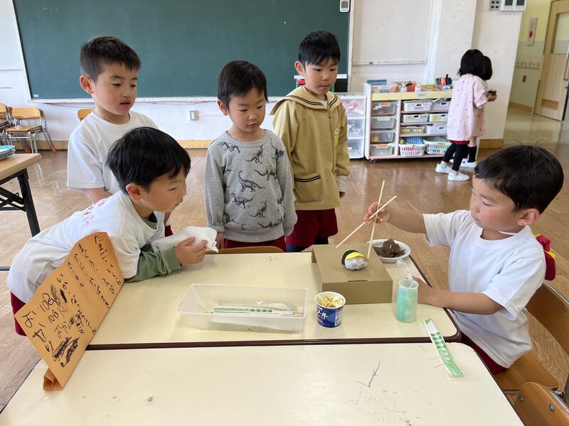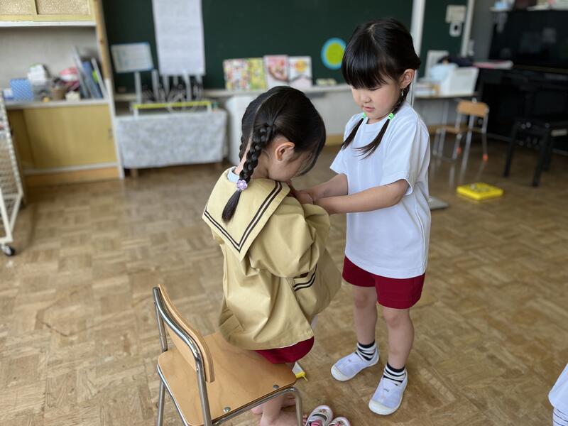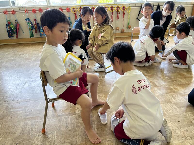 今日は、発育測定の日です。つくし組(4歳児)は初めてなので、たけのこ組(5歳児)のみんなが、こうやるんだよと優しく教えてあげています。どのくらい大きくなったかな。