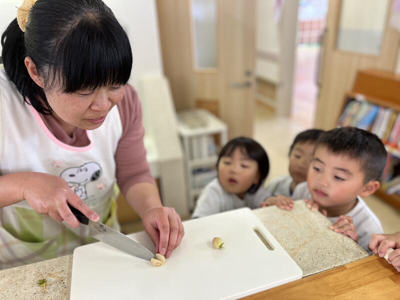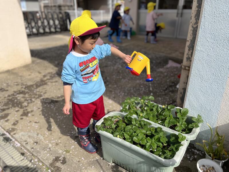 幼稚園で、かわいらしいいちごがとれました。みんなでいただきました。