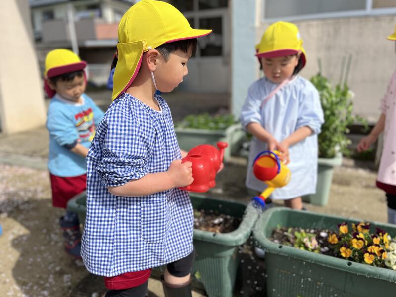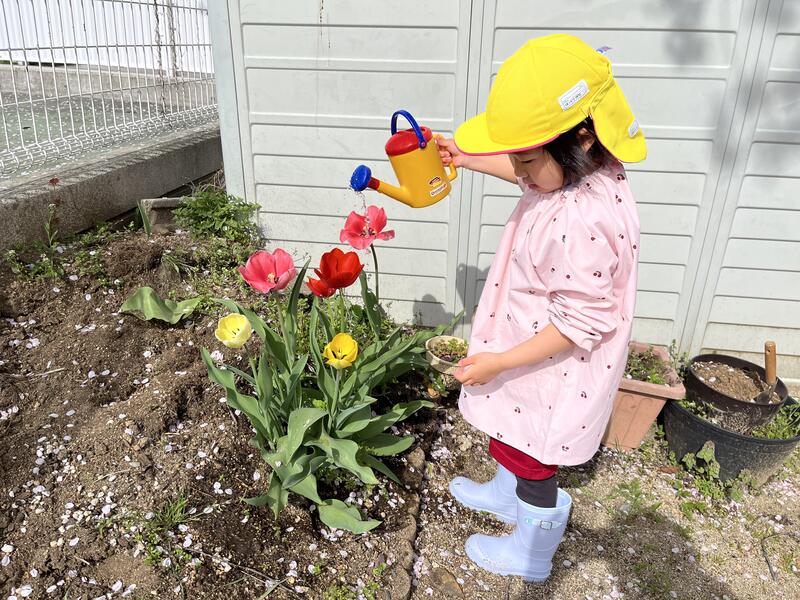 今朝も、みんなでお花に水をあげました。きれいな花が咲きました。