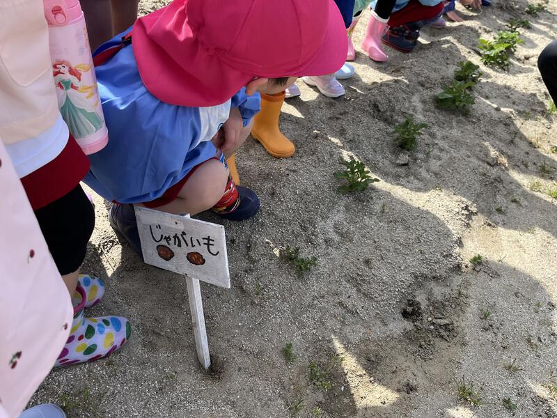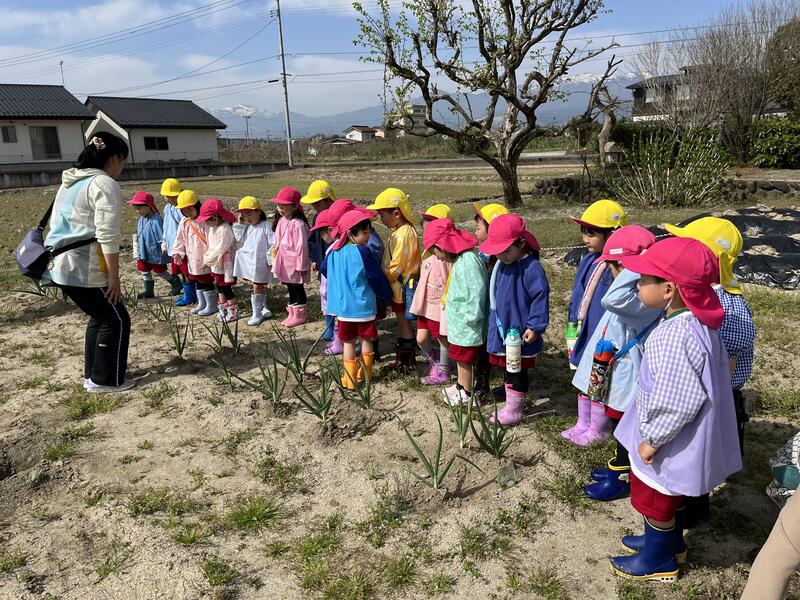 つくし組(年少組)が、たけのこ組(年長組)に連れられて、畑に出かけました。