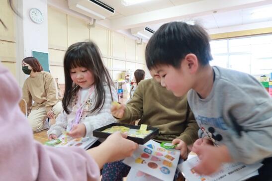 最後に、参加シールを貼って、恒例の繋いであんころ餅をしてさよならのあいさつです。