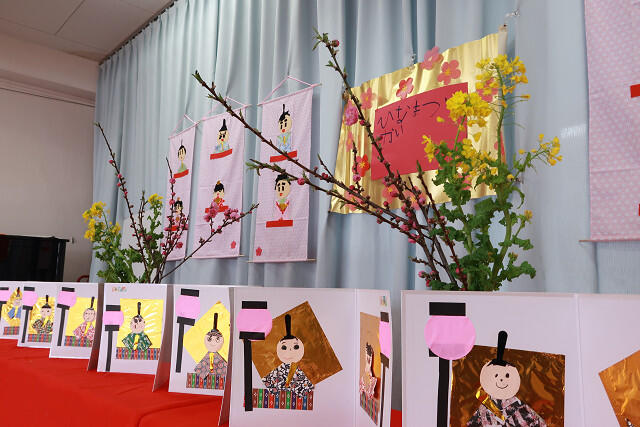 ステージ側には、子どもたちが作ったおひな様が素敵に飾ってあります。