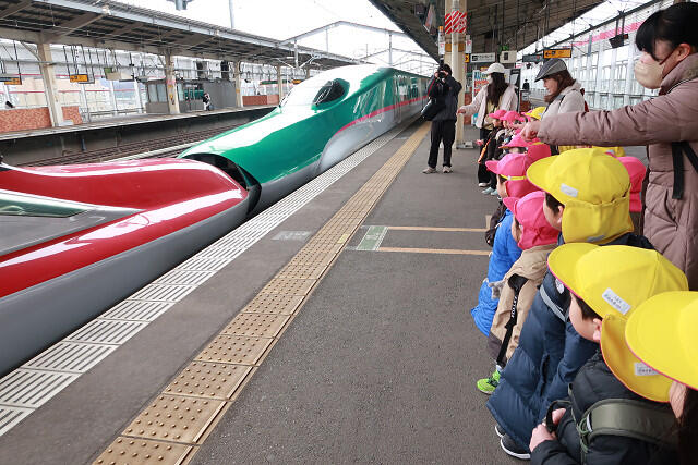 新幹線ホーム着いたとき、丁度停車したこまちとやまびこが連結した新幹線を見て、子どもたちは大喜びです。