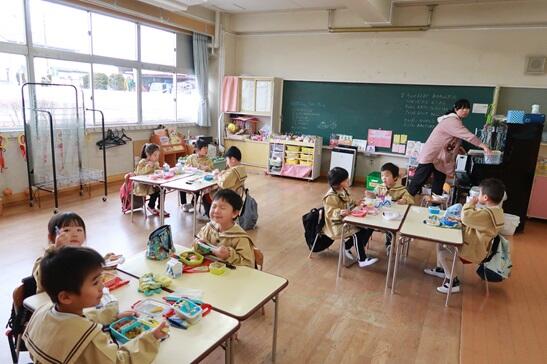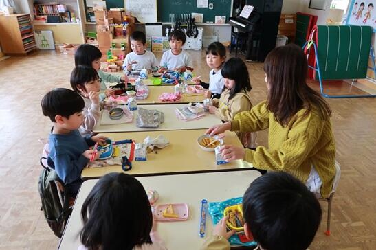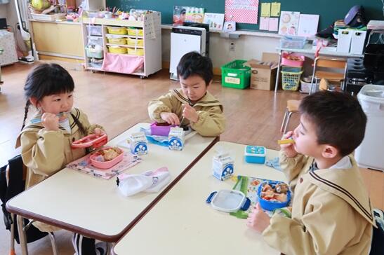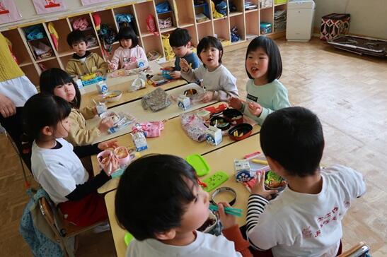 年長さんは9名みんな揃って、お昼のお弁当の時に、楽しくお話ししながらいただきました。