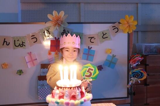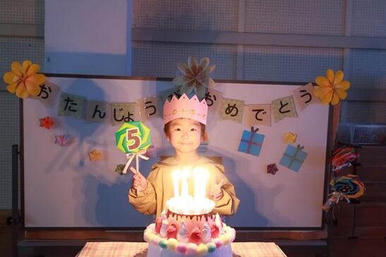 バースデーケーキを前に笑顔です。5歳の誕生日おめでとう!