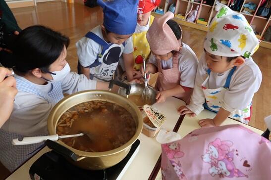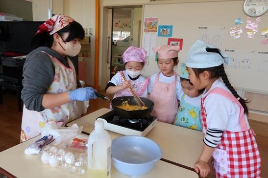 お別れ会の前に、年少つくし組は年長たけのこ組に内緒で、会食の準備をしています。メニューはちらし寿司です。