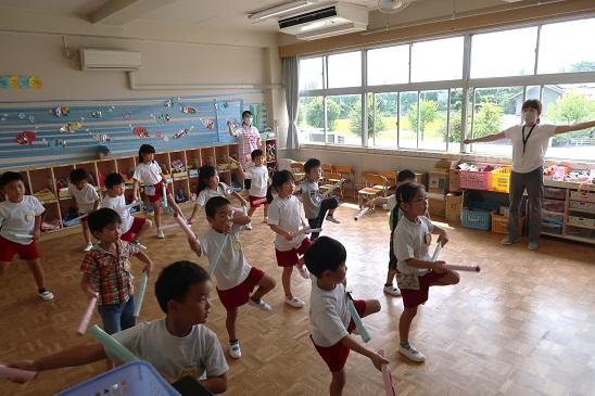年長たけのこ組では、園児たちがノリノリで「さぁ、これが日本のおまつりだ!」のダンスをしています。実習生も園児に負けずに踊っています。