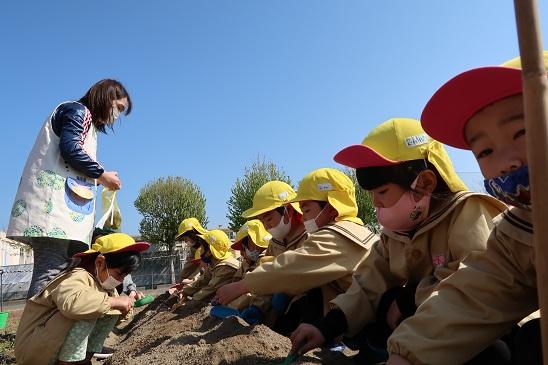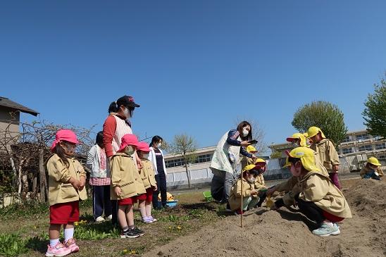 最初は、年長たけのこ組が植える様子を、年少つくし組が観察です。